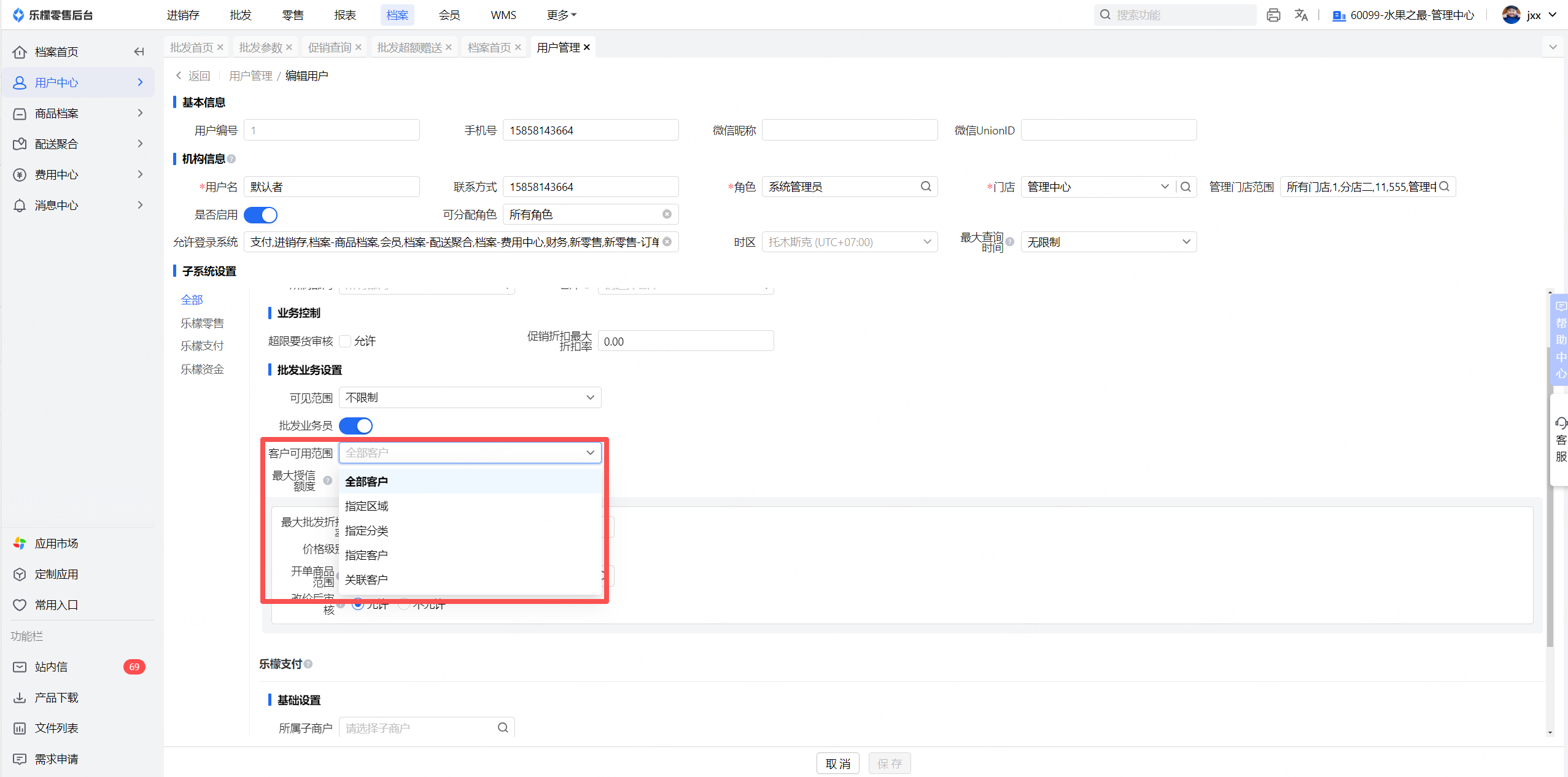 乐檬商贸 - 用户管理-批发业务设置新增客户可用范围