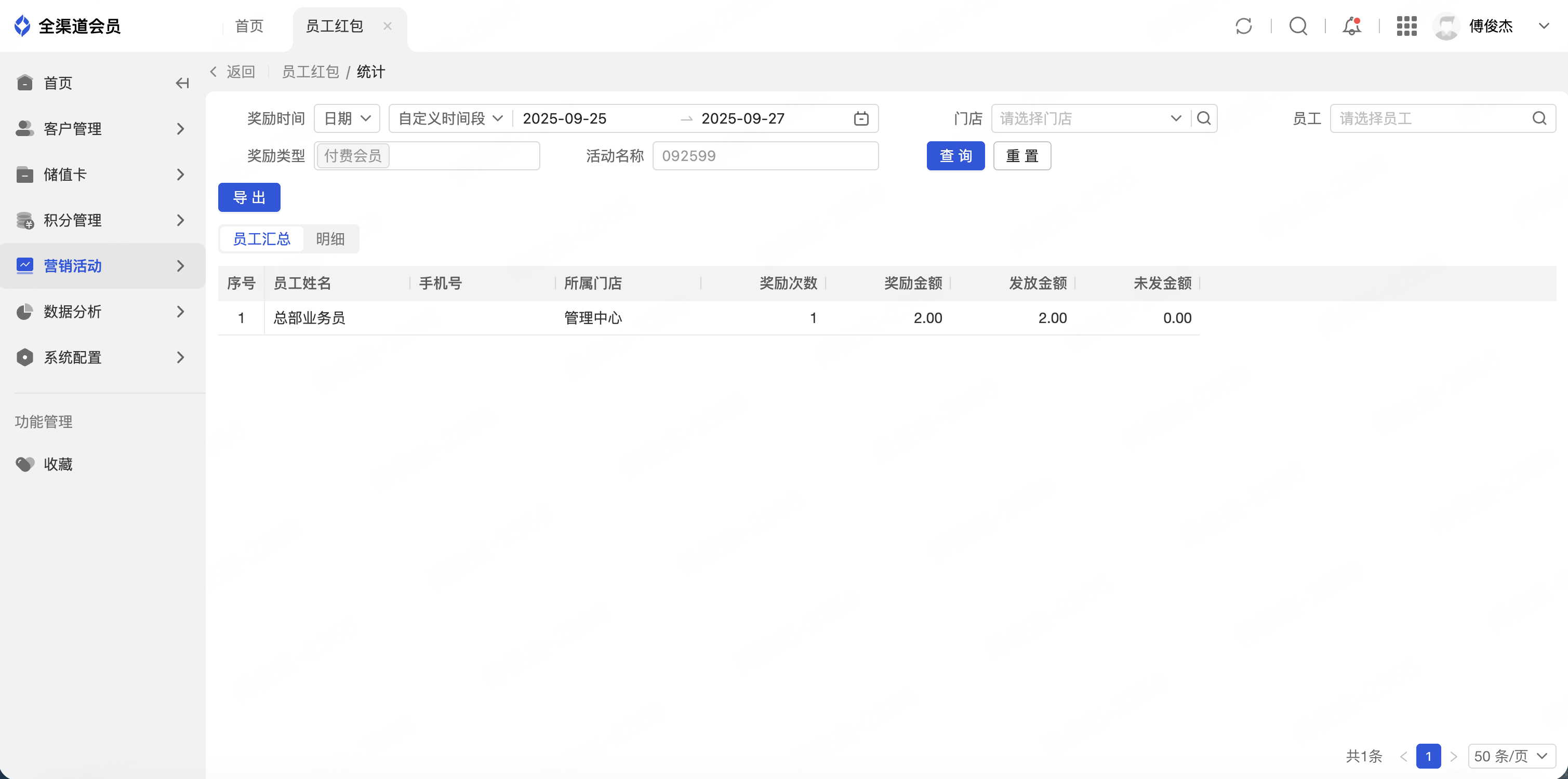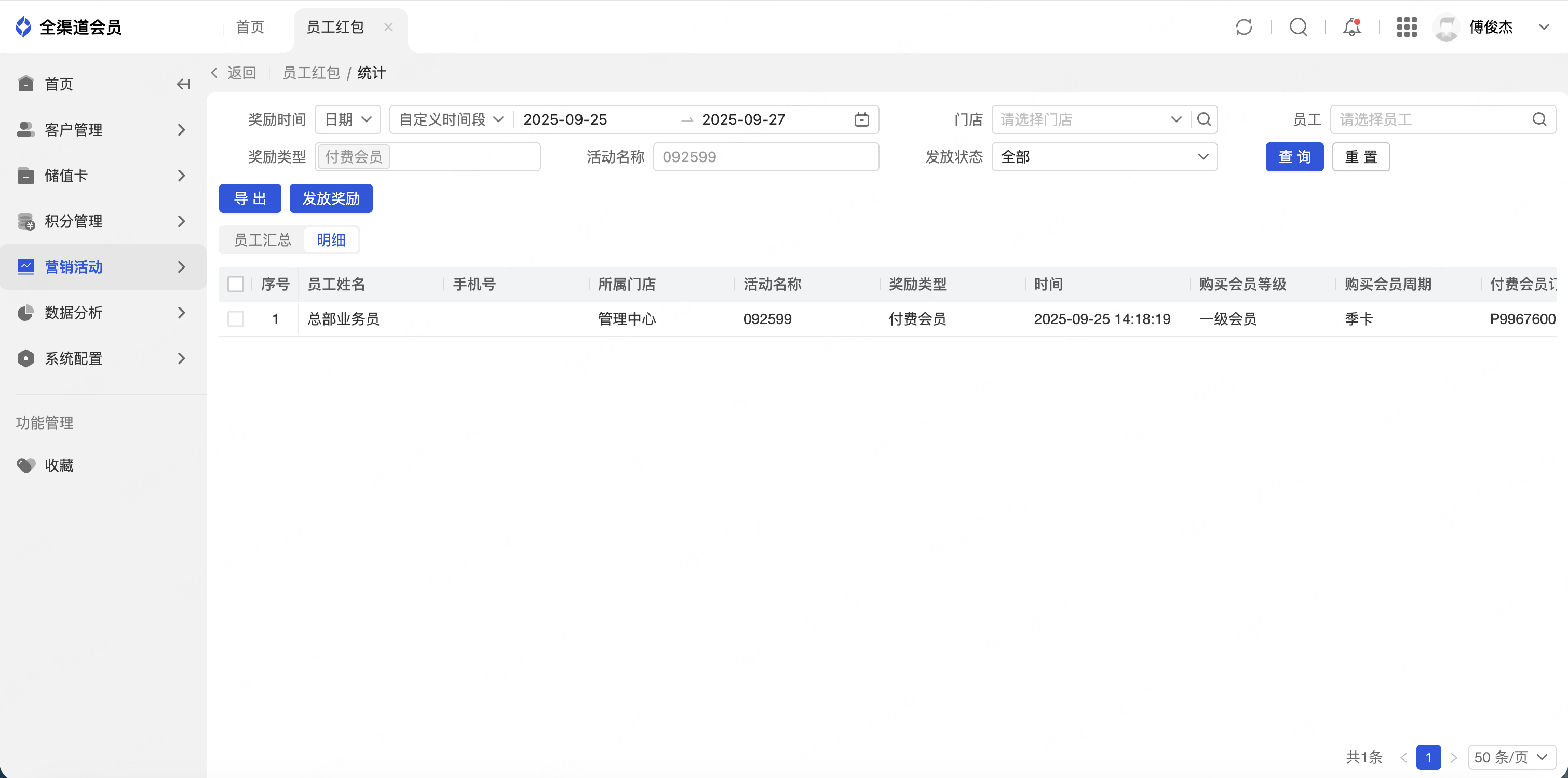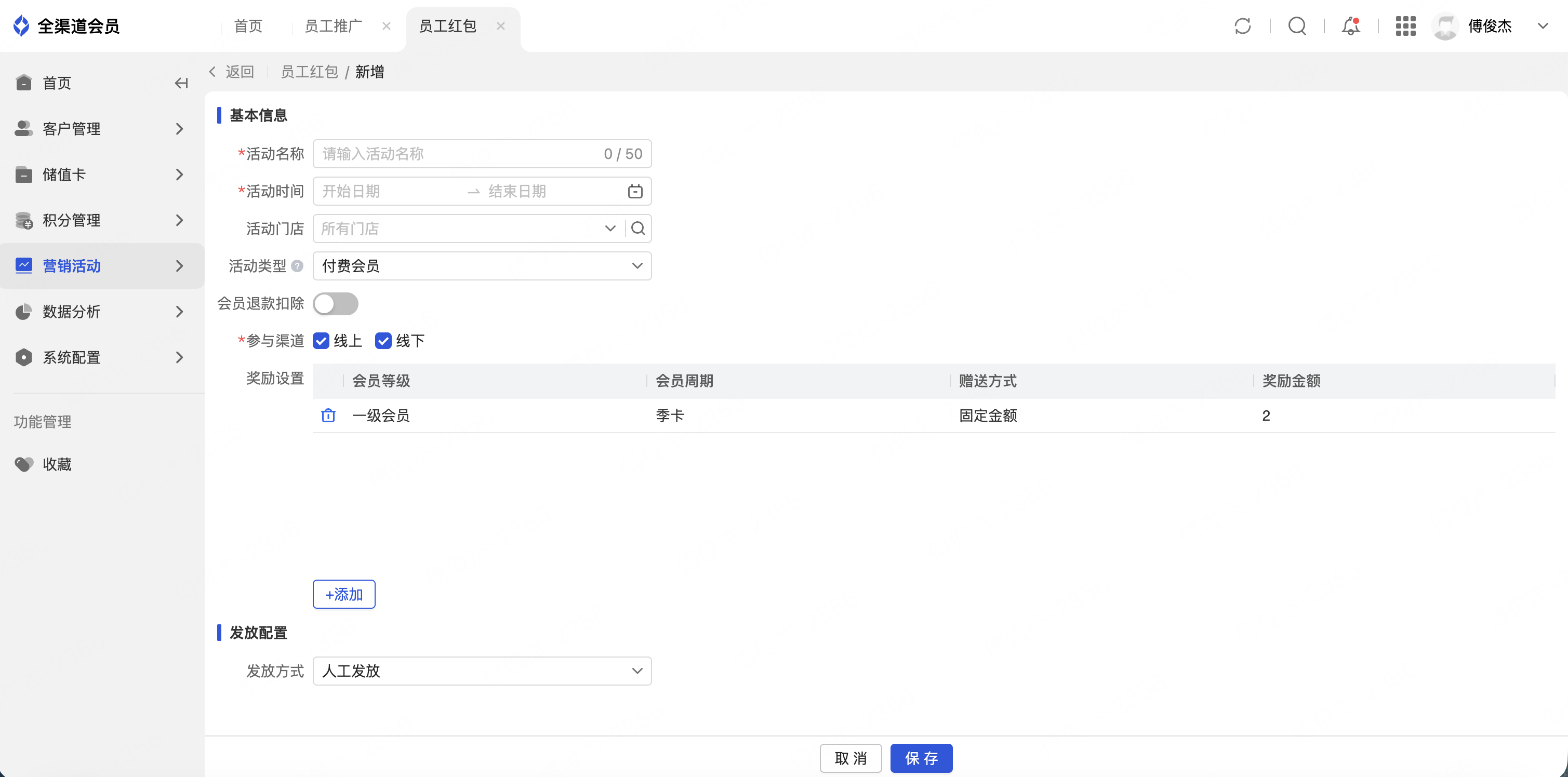 1、全渠道会员-员工红包,新增了活动类型“付费会员”,支持设计统计的渠道以及不同付费会员的等级、周期的奖励内容,目前支持统计的方式有: