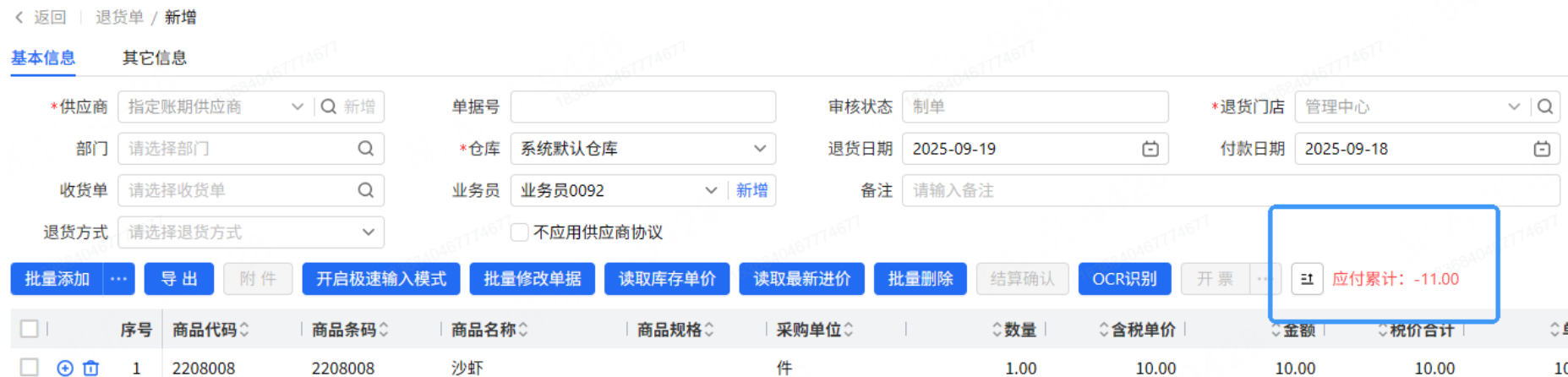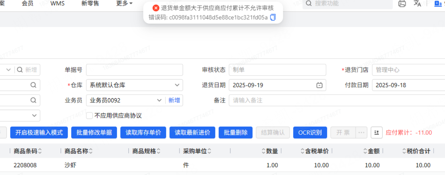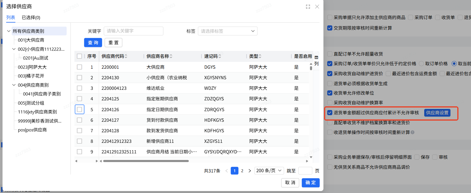 采购参数【退货单金额超过供应商应付累计不允许审核】可以避免门店退货出现倒挂金额的情况,但是有时候财务需要允许部分供应商可以进行退货的操作。需要支持参数能按供应商控制