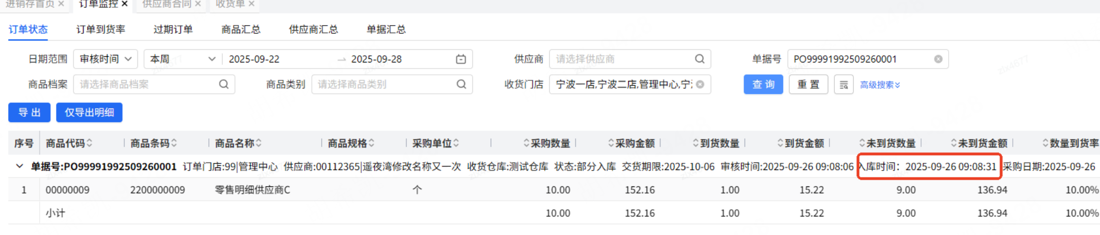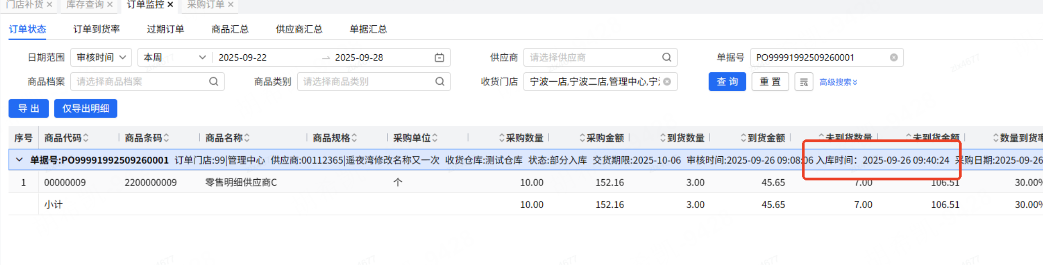 订单监控里面的入库时间如果是多个收货单收货会显示最早的一个日期,客户认为按这个时间看都不知道后面还有入库,应该按最晚的显示