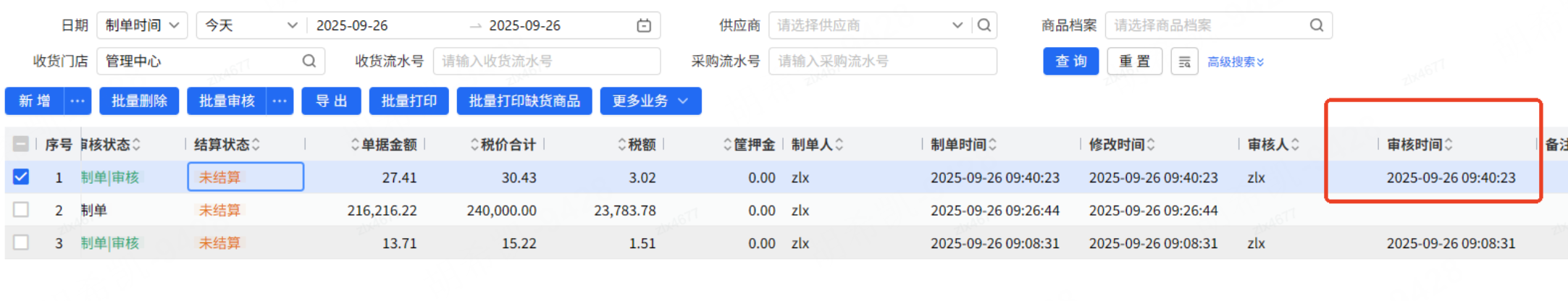现规则:采购订单生成收货单审核后,采购订单存入收货单审核时间,后续再次收货不再更新