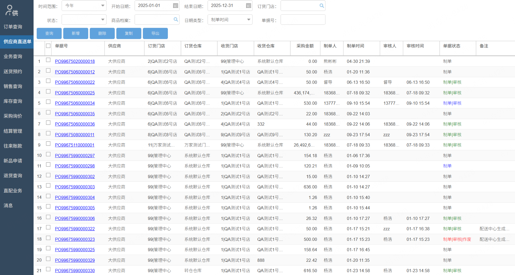 6、AMA/APP-供应商直送单单据制单状态不在对应供应平台展示业务后续流转逻辑与当前一致,供应商制单、审核、门店确认收货,生成对应收货单、调出/调入单