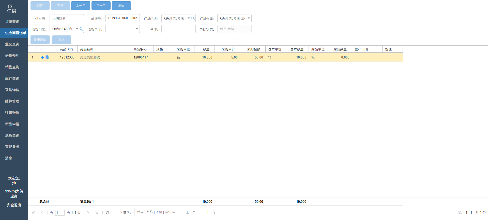 5、单据保存,对应AMA-供应向直送单生成一条制单状态单据;以及供应商平台APP、零售APP同菜单