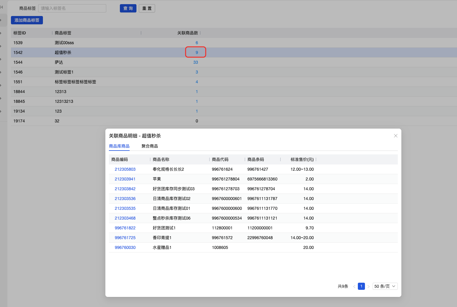 商品属性、商品服务、商品标签,点击关联商品数的数字弹窗展示关联的商品明细