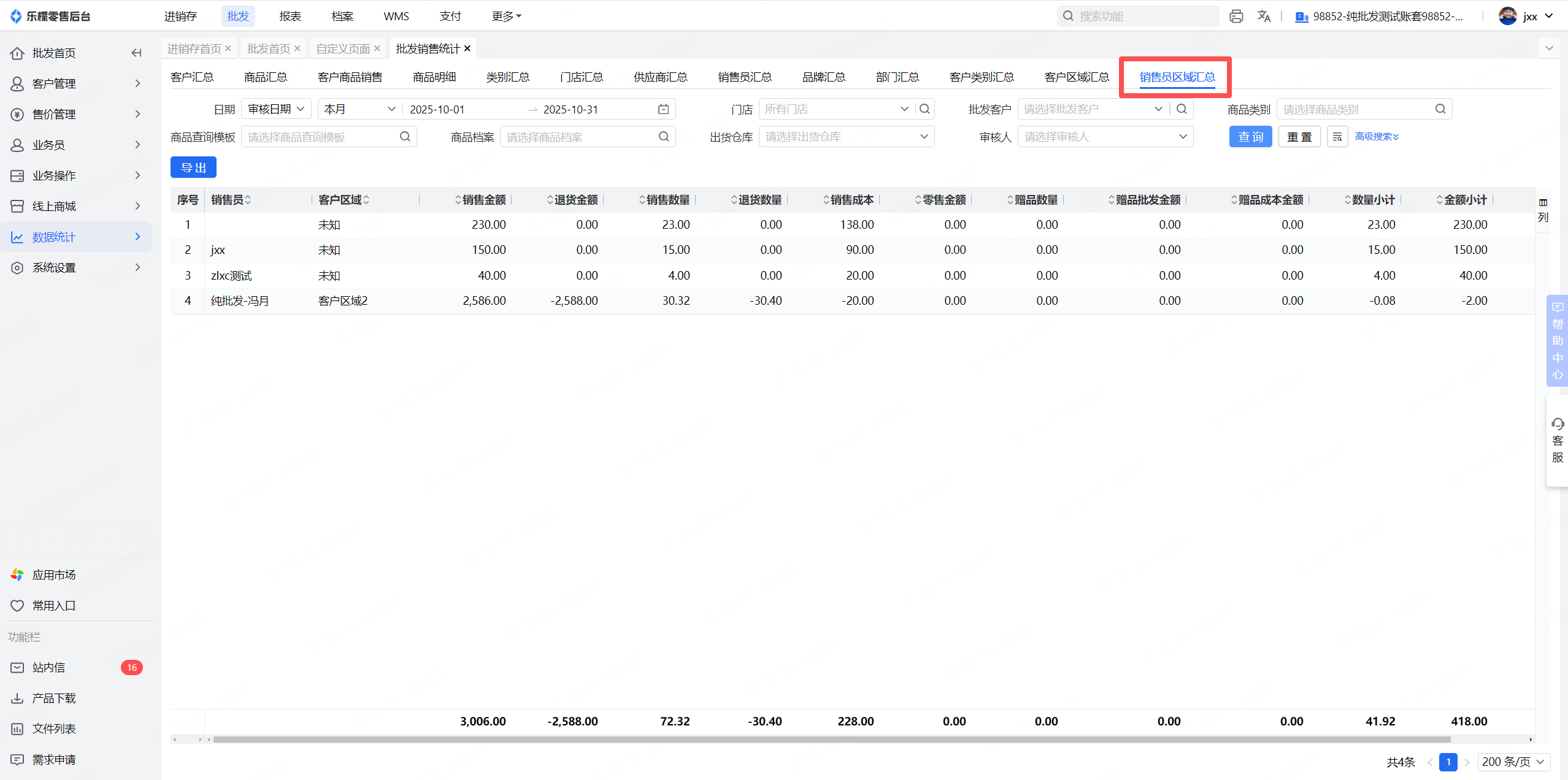 功能路径:批发-数据统计-批发销售统计-销售员区域汇总