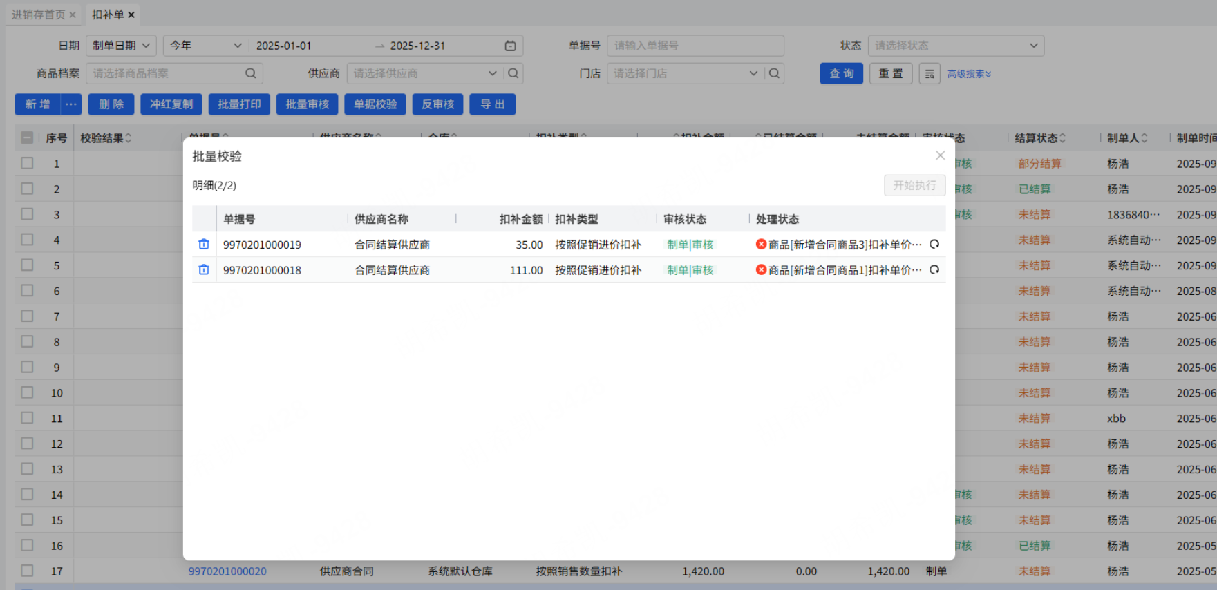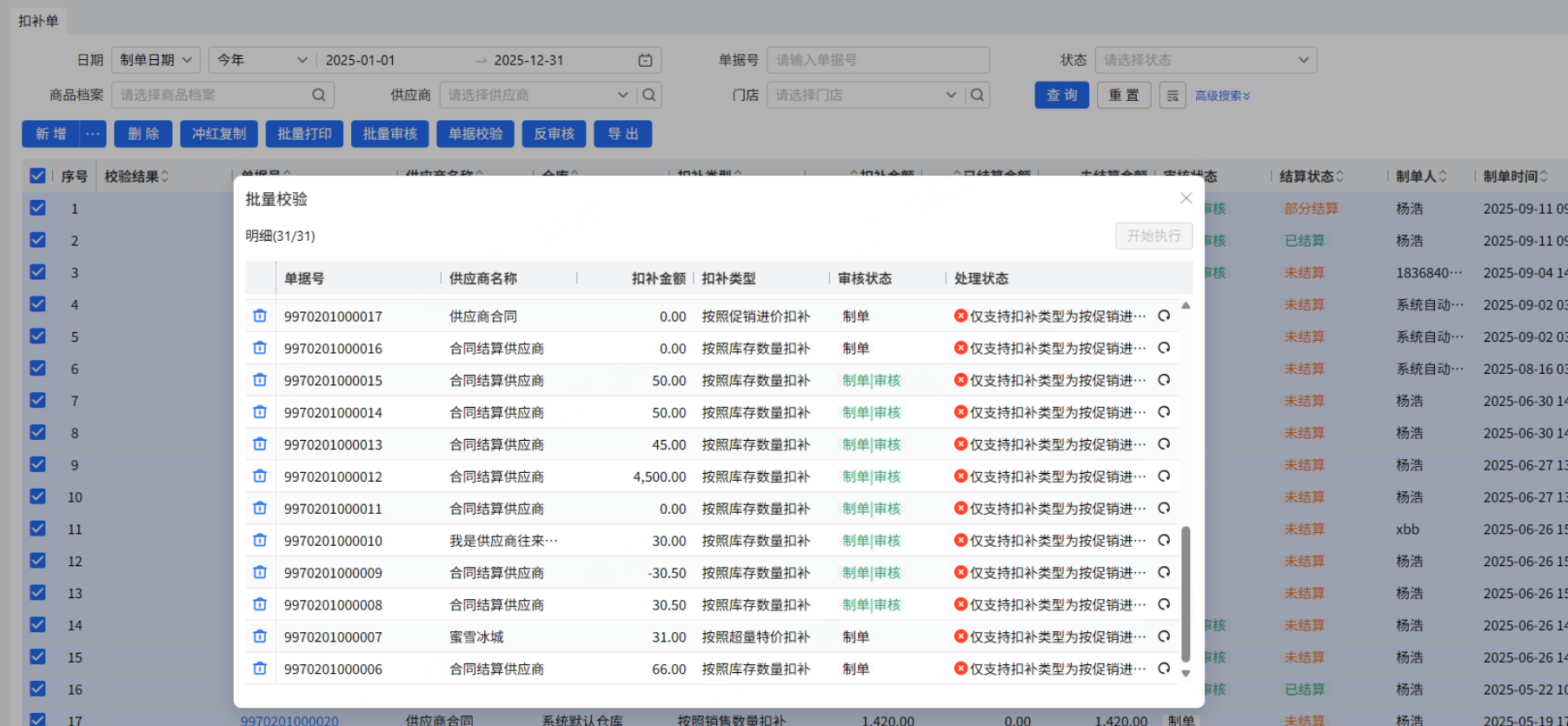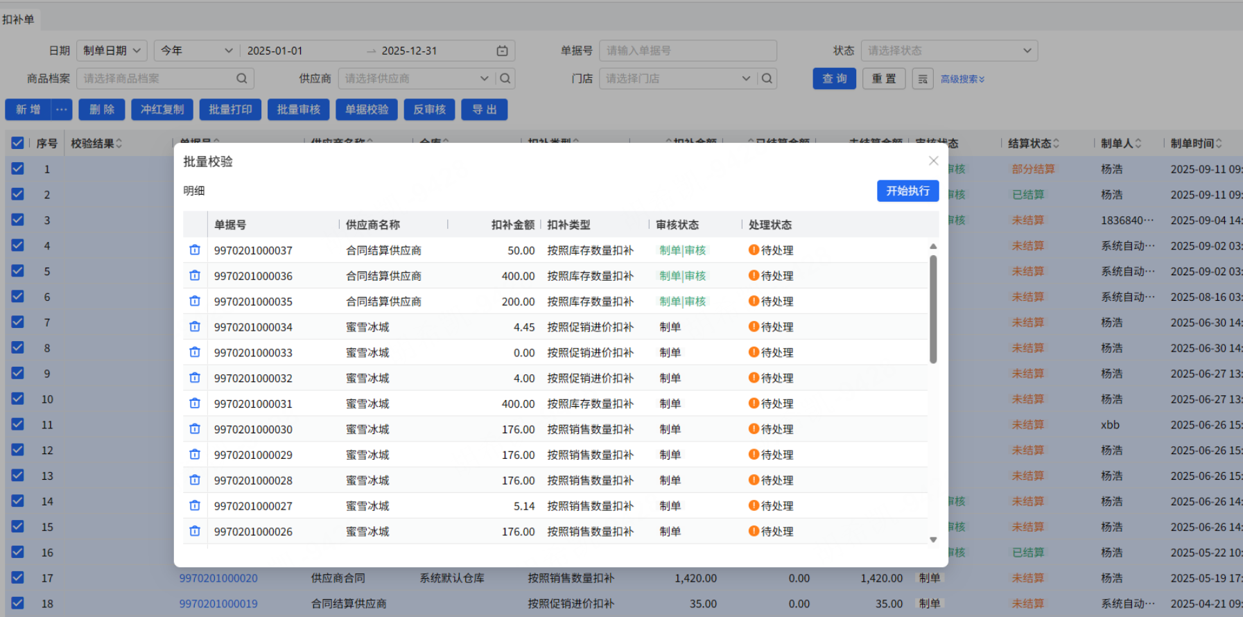 点击按钮,显示批量的弹窗,点击执行,一条条扣补单执行检查