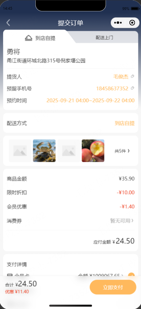 订单结算页,门店名称和门店地址显示提货点名称和提货点地址,不允许切换