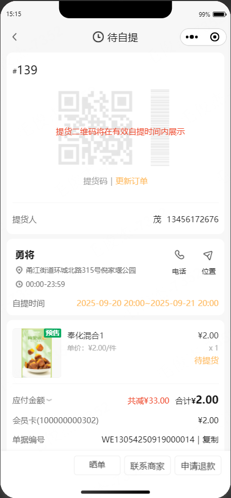 订单详情页,门店名称和门店地址显示提货点名称和提货点地址,点击电话联系分销商的电话,点击位置显示提货点的位置