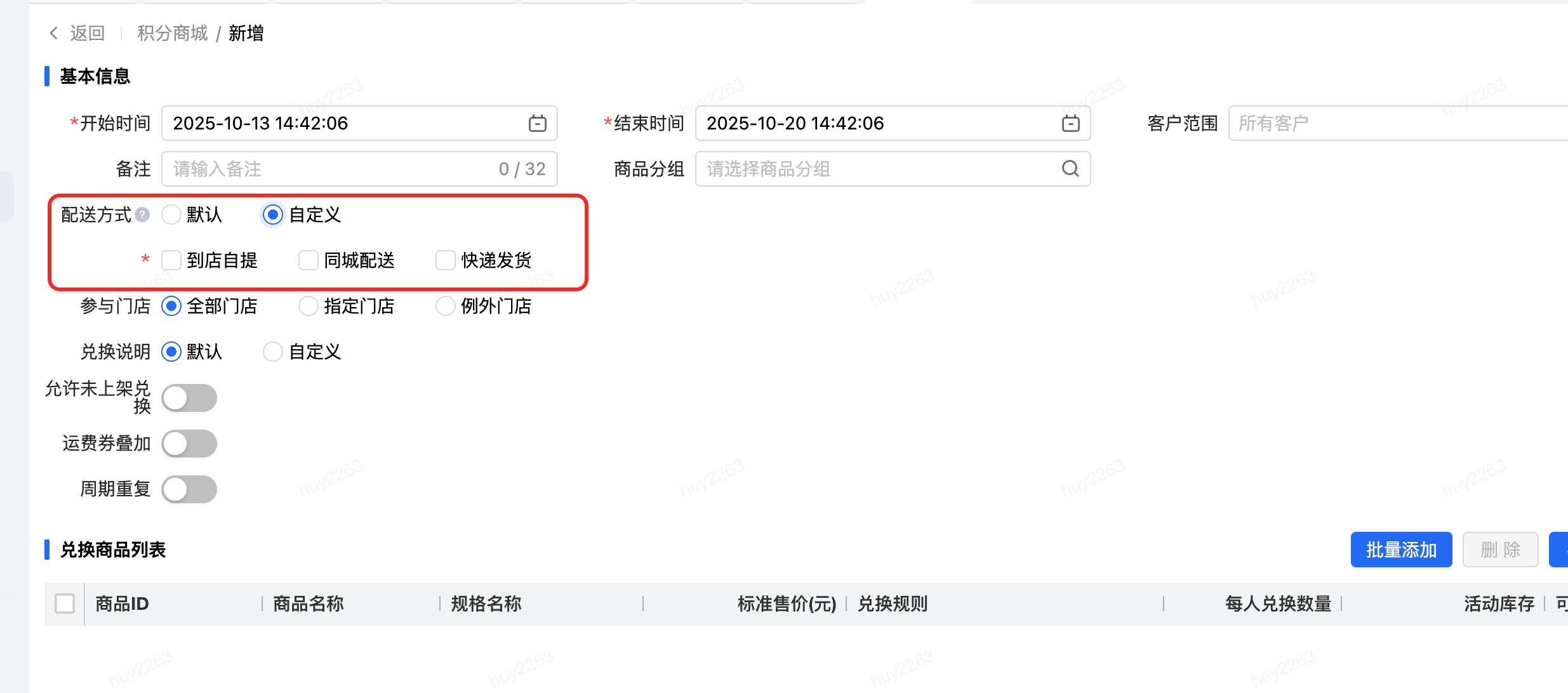 目前积分商城商品的配送方式和商品库相同,客户实际业务需要给积分兑换商品设置不同的配送方式。