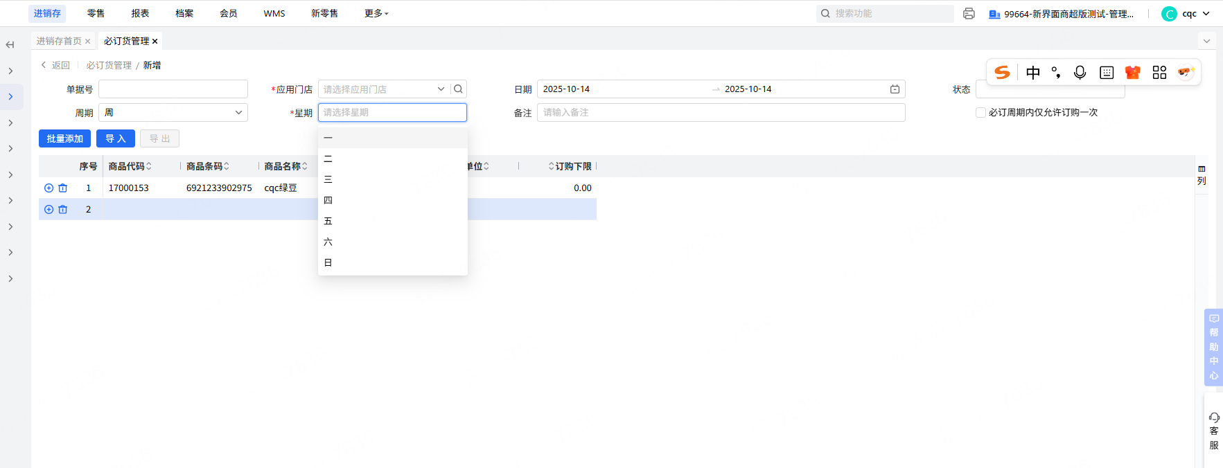 门店在向中心要货时,如果满足必订货管理中设置的时间和应用门店,那么程序自动在要货明细中优先加载必订货商品。