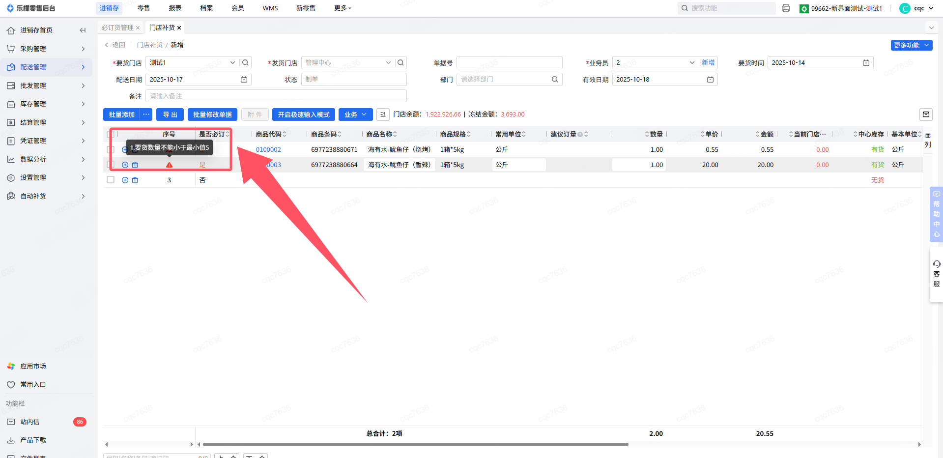 案例举例,设置了上图3个商品的必订货,门店补货会有以下几个变化点: