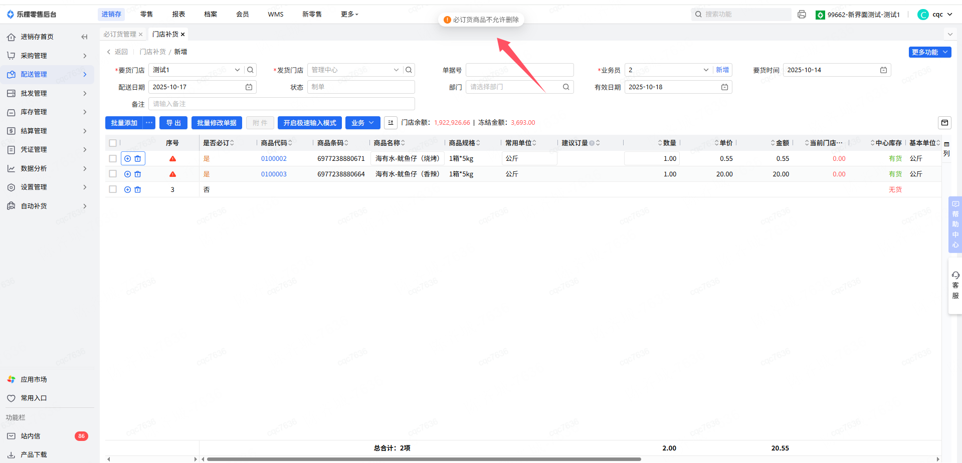 必订货商品不允许删除 | 尝试删除时会提示【必订货商品不允许删除】 |