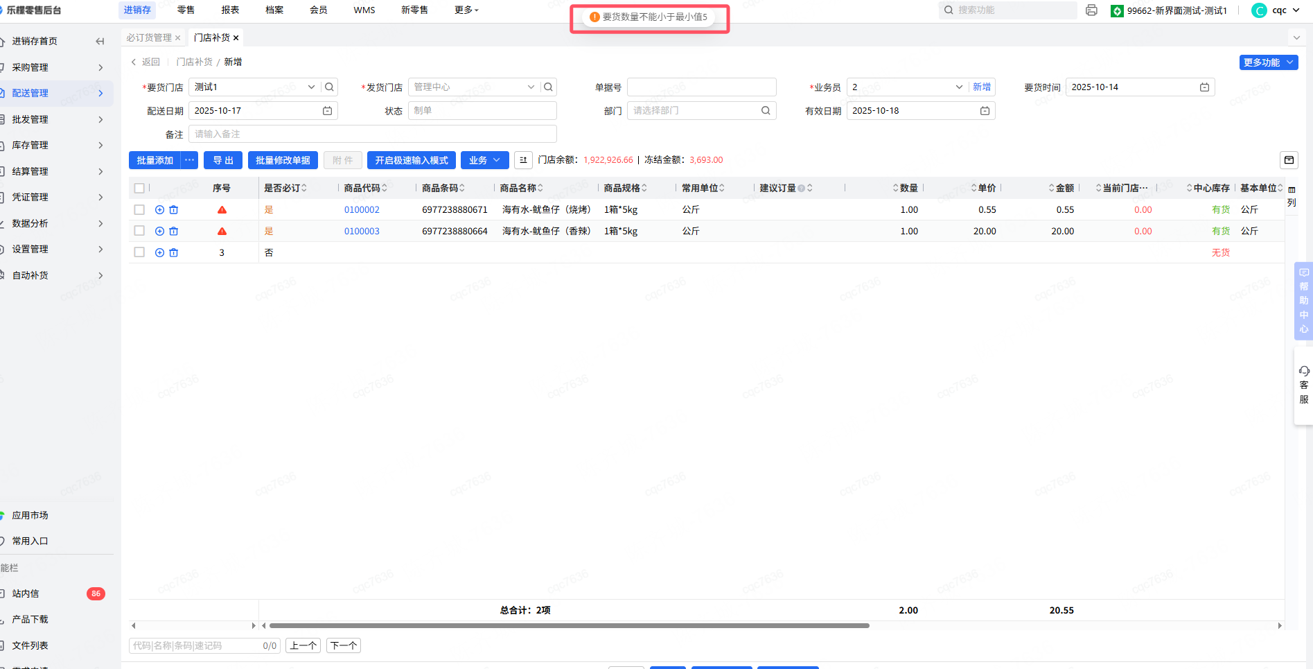启参数“门店要货不可以超过中心库存量”且商品类别未勾选“要货允许超过中心库存”,或者未开启但是商品配送属性设置了要货不允许超过中心库存量