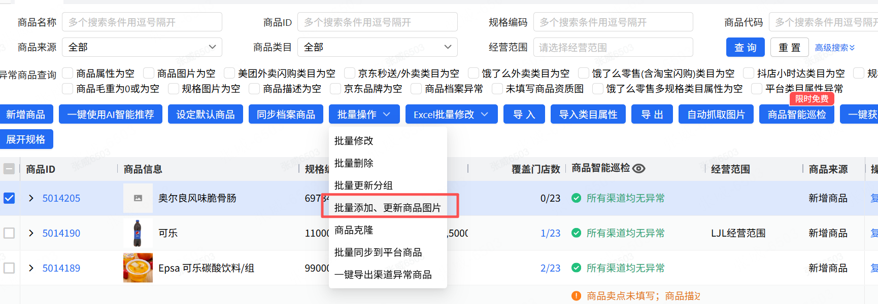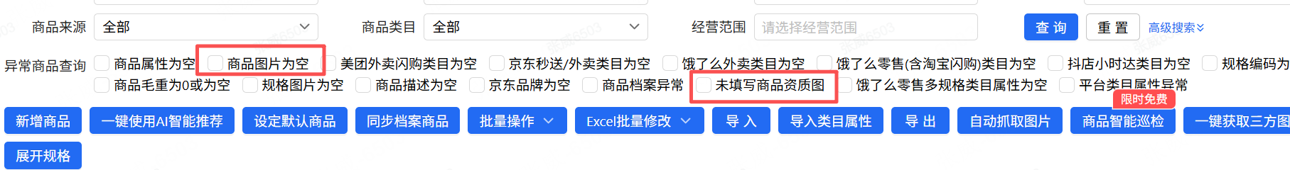 1、在商品库中导出图片为空或资质为空的商品,这个时候可以拿到商品ID或规格编码或商品名称