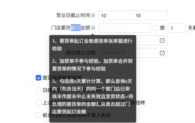 3、勾选按x天累计计算,那么查询x天内(包含当天)的同一个家门店已审核未作废未中止未失效且发货状态=待处理的要货单的金额汇总是否超过门店要货起订金额