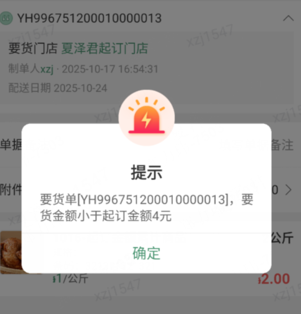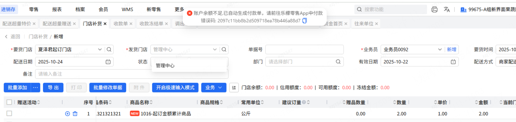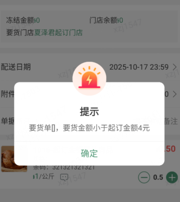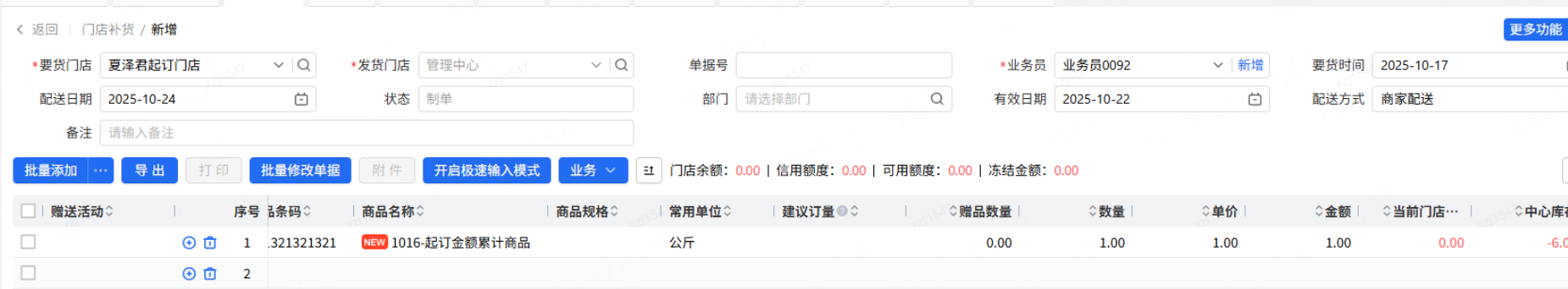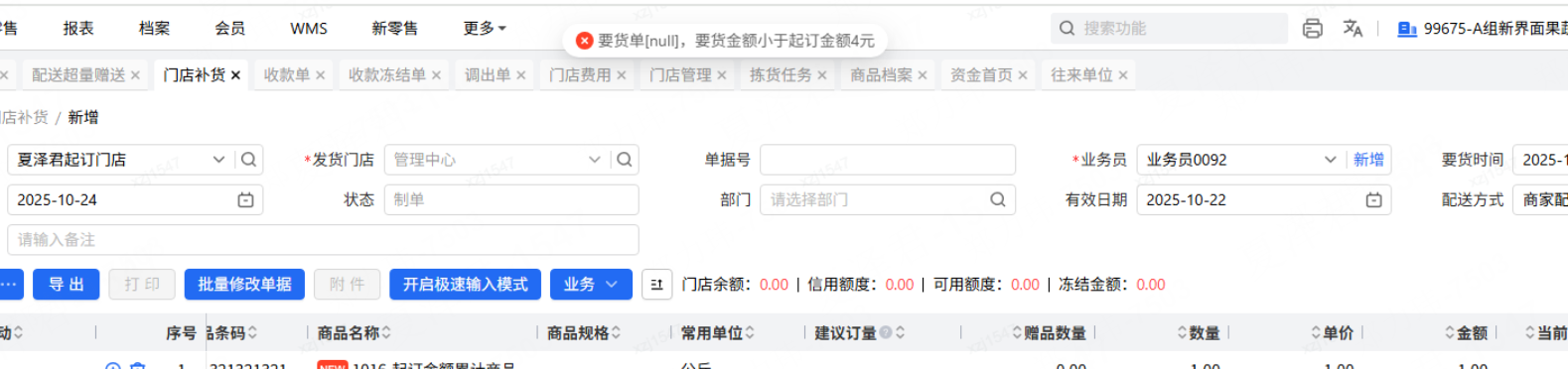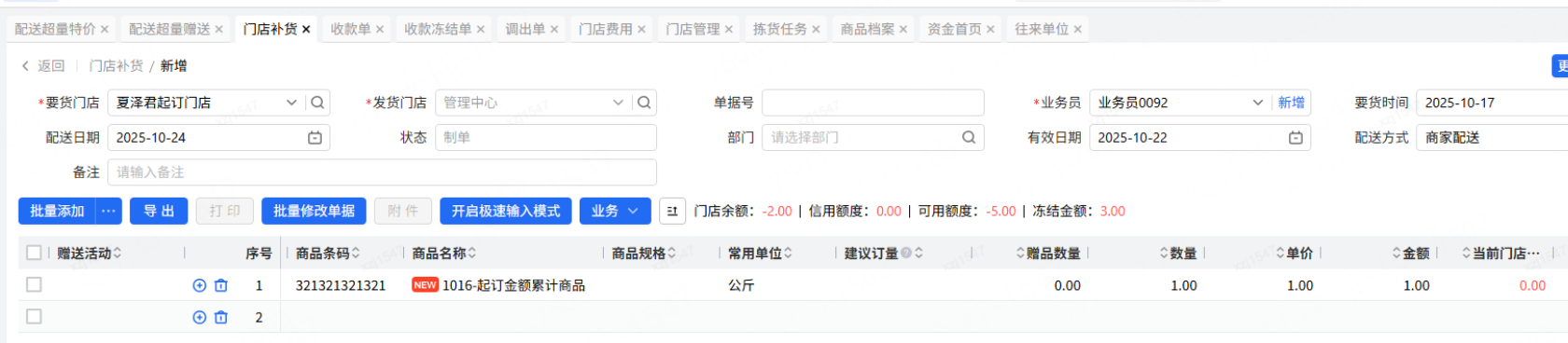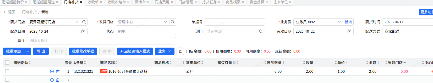 但现起订金额按单据金额控制,门店一天内要下了好多单子,限制起订金额:1000元。第一个单子1000元,第二个单子20元,这种是符合规则的。但是系统逻辑要求每个单子都得满足起订量。
