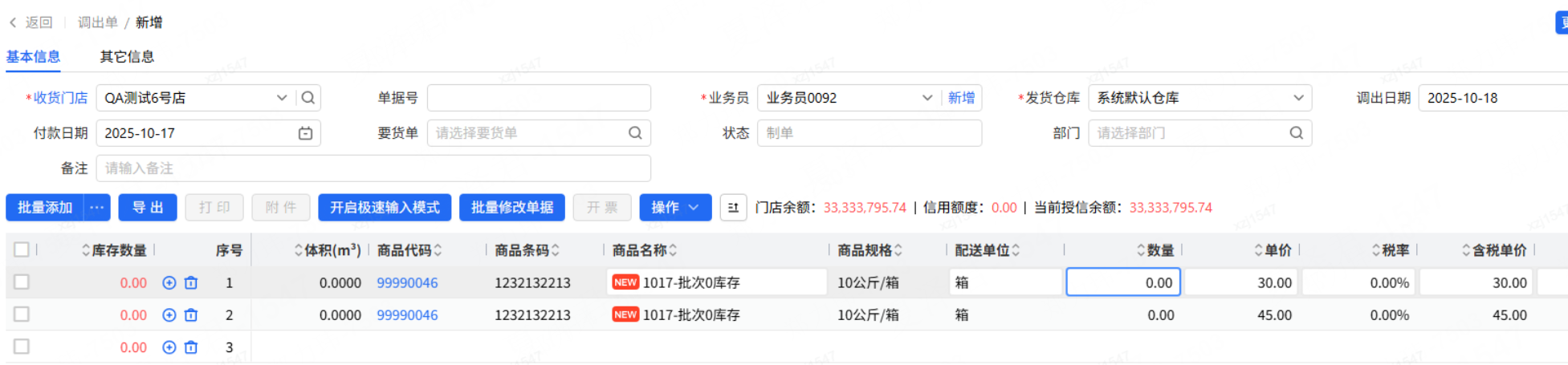 乐檬进销存 - 调出单批次无库存时配送价优化
