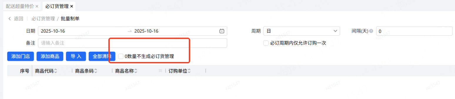 批量制单界面增加参数“0数量不生成必订货管理”,默认不勾选