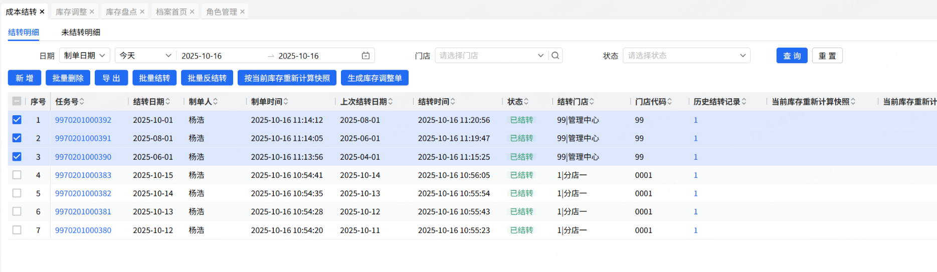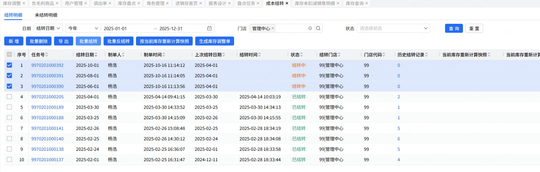 结转时,先校验“上次结转日期”,如果日期不对,则系统直接自动调整“上次结转日期”