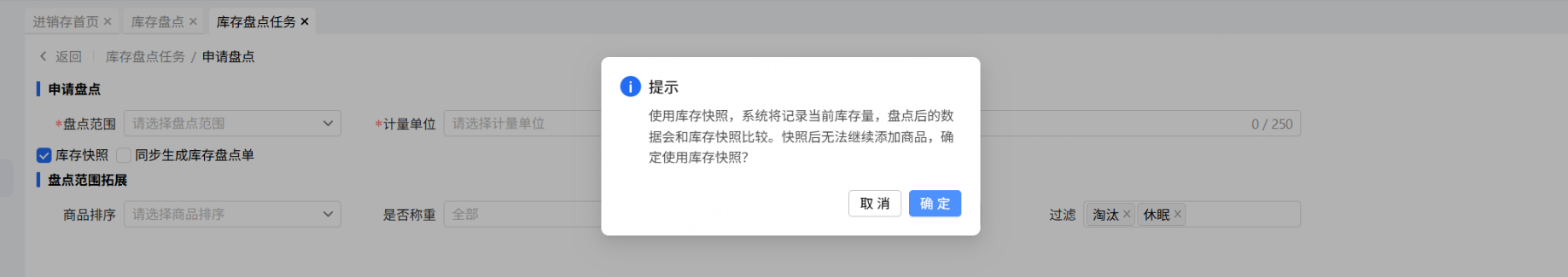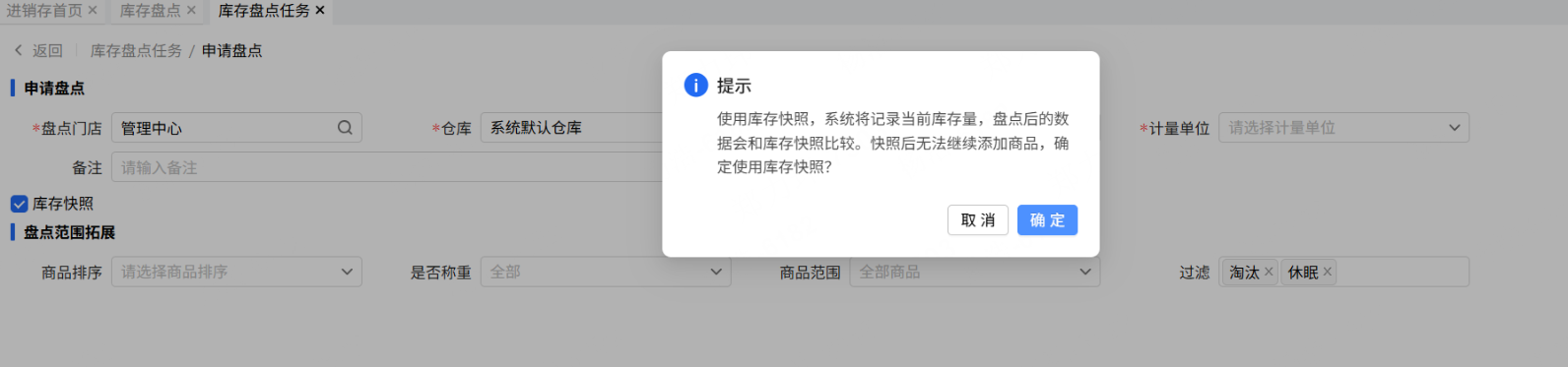 当选项从“不勾选”改为“勾选”时,增加二次弹窗提醒:使用库存快照,系统将记录当前库存量,盘点后的数据会和库存快照比较。快照后无法继续添加商品,确定使用库存快照?