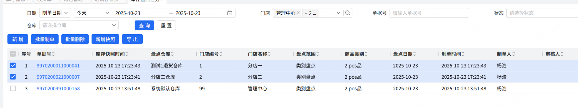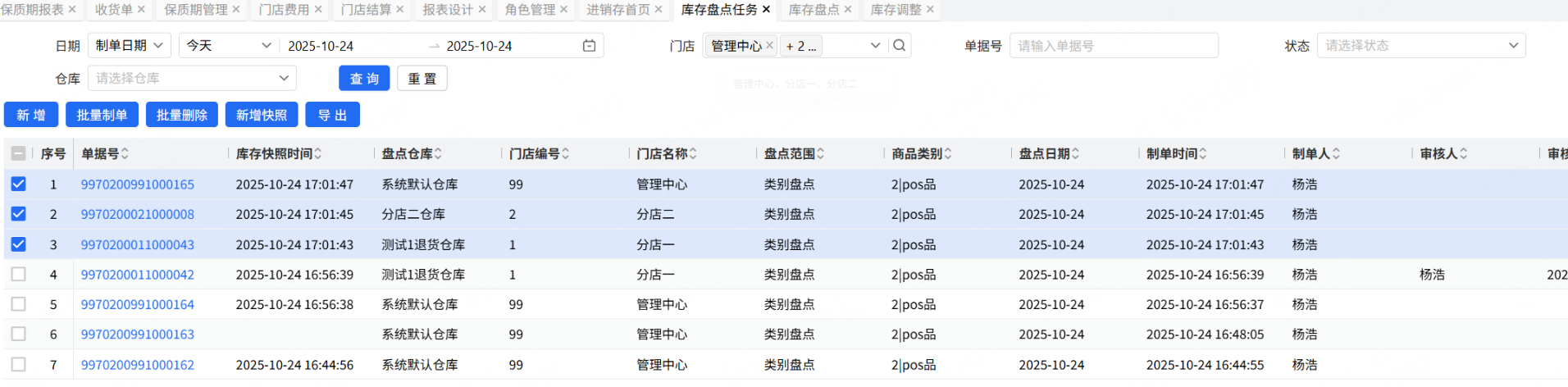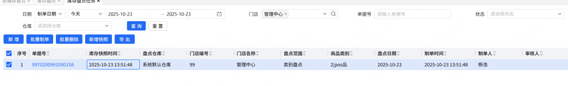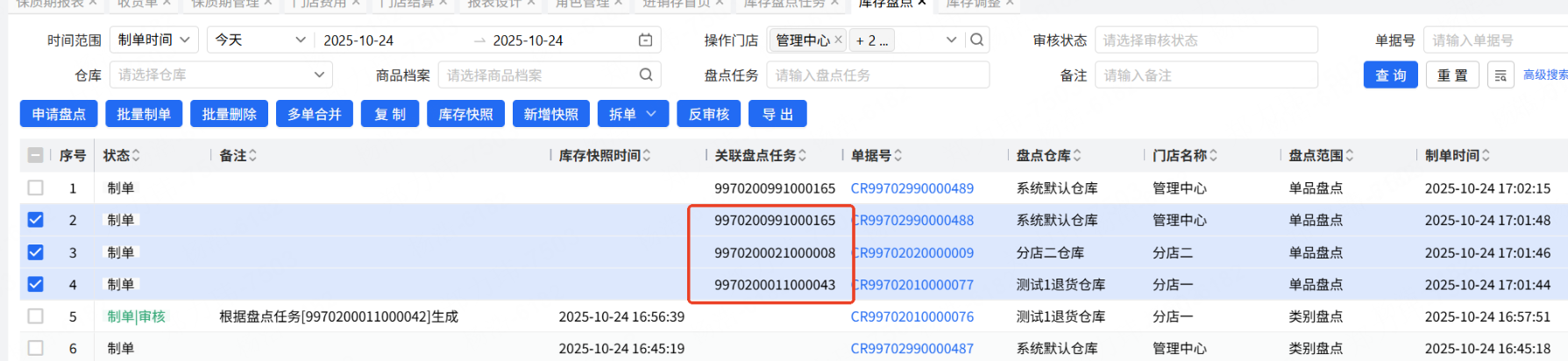 门店盘点使用库存盘点任务,总部创建盘点任务,门店盘点的时候调用盘点任务,数据才会合并,一旦不关联盘点任务,后续的操作会很多。为了防止这个问题的发生,需要总部关闭门店的盘点单新增权限,创建好盘点任务后,帮门店也把关联的盘点单生成,保证门店直接打开盘点单进行盘点,所有的盘点数据汇总在盘点任务。客户现在门店有77个,盘点任务支持批量制单,但是盘点单的批量制单不会关联盘点任务,导致只能一个门店一个门店的处理,另外现在的盘点任务不支持新增的时候设置快照,只能新增完成后,关联快照