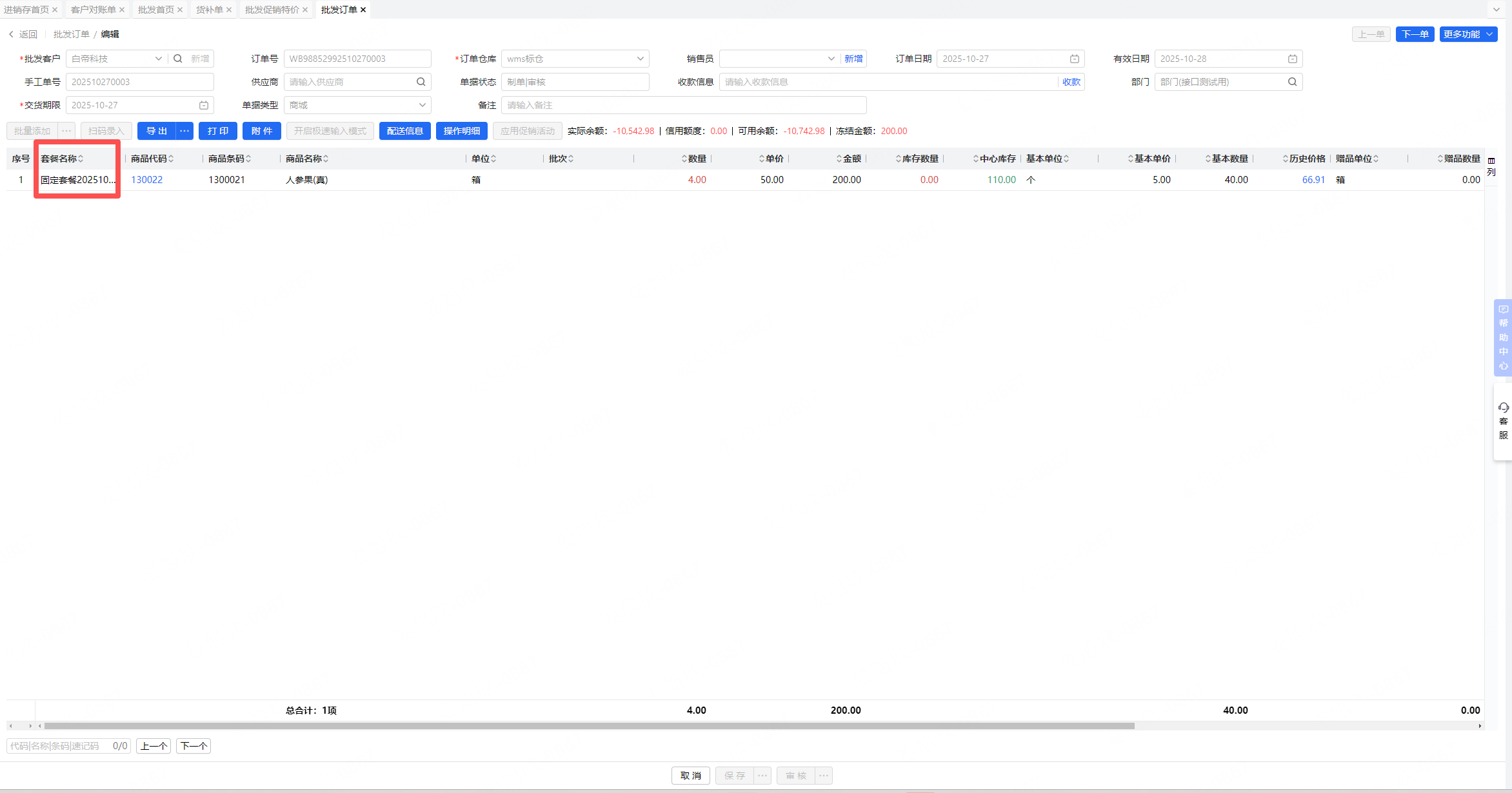 3、批发订单不允许修改套餐的任意数据;生成销售单时以商品维度不以套餐维度
