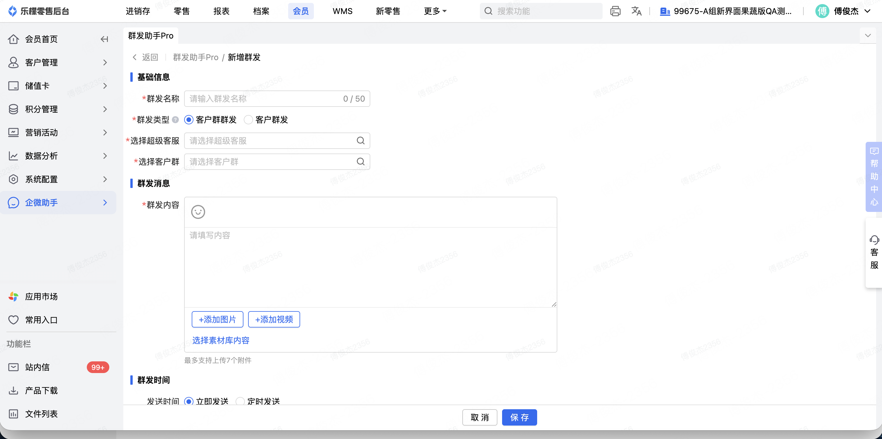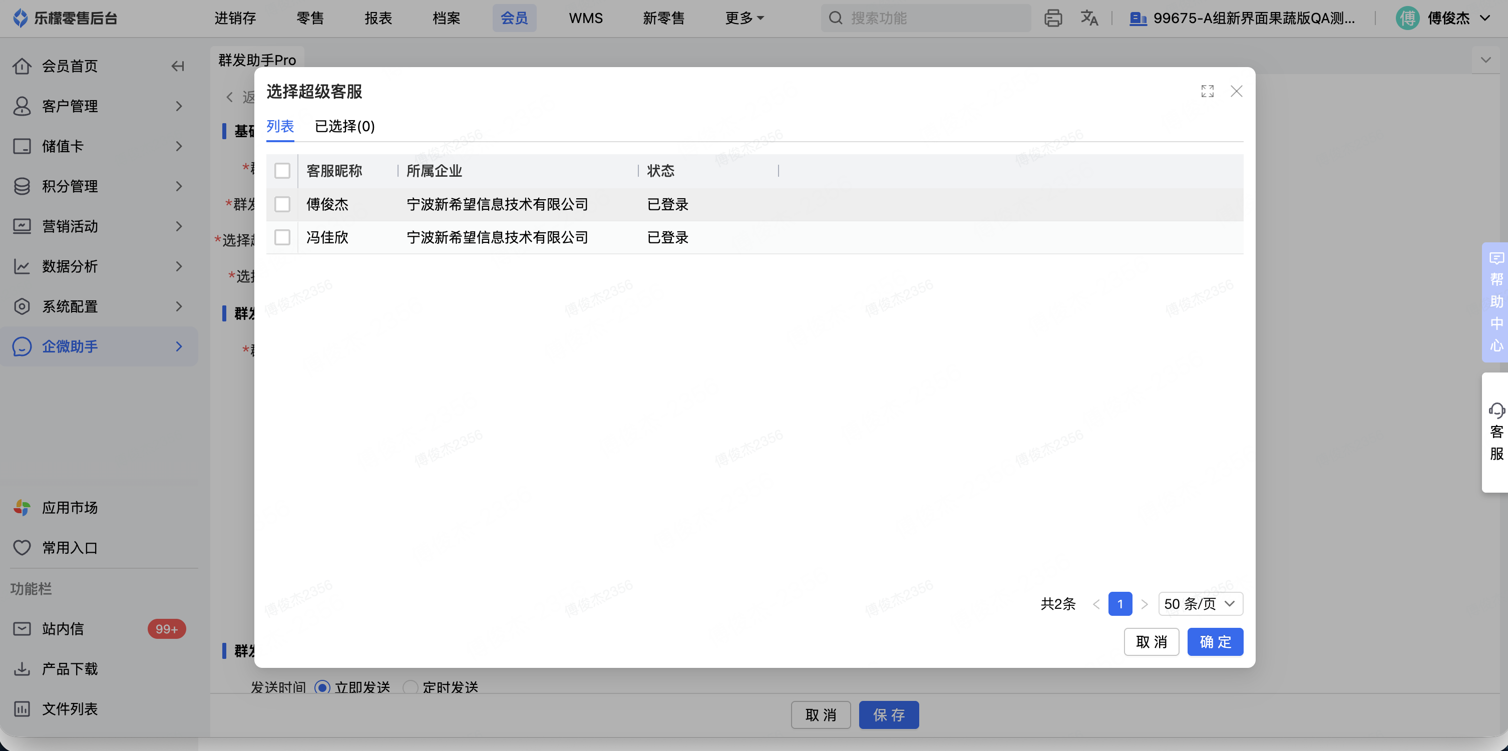 2、新增群发时,需要通过后台配置的超级客服进行消息群发,通过指定超级客服+客户群/客户的方式,完成消息的快速群发,该群发动作无需企微员工在手机上二次确认发送