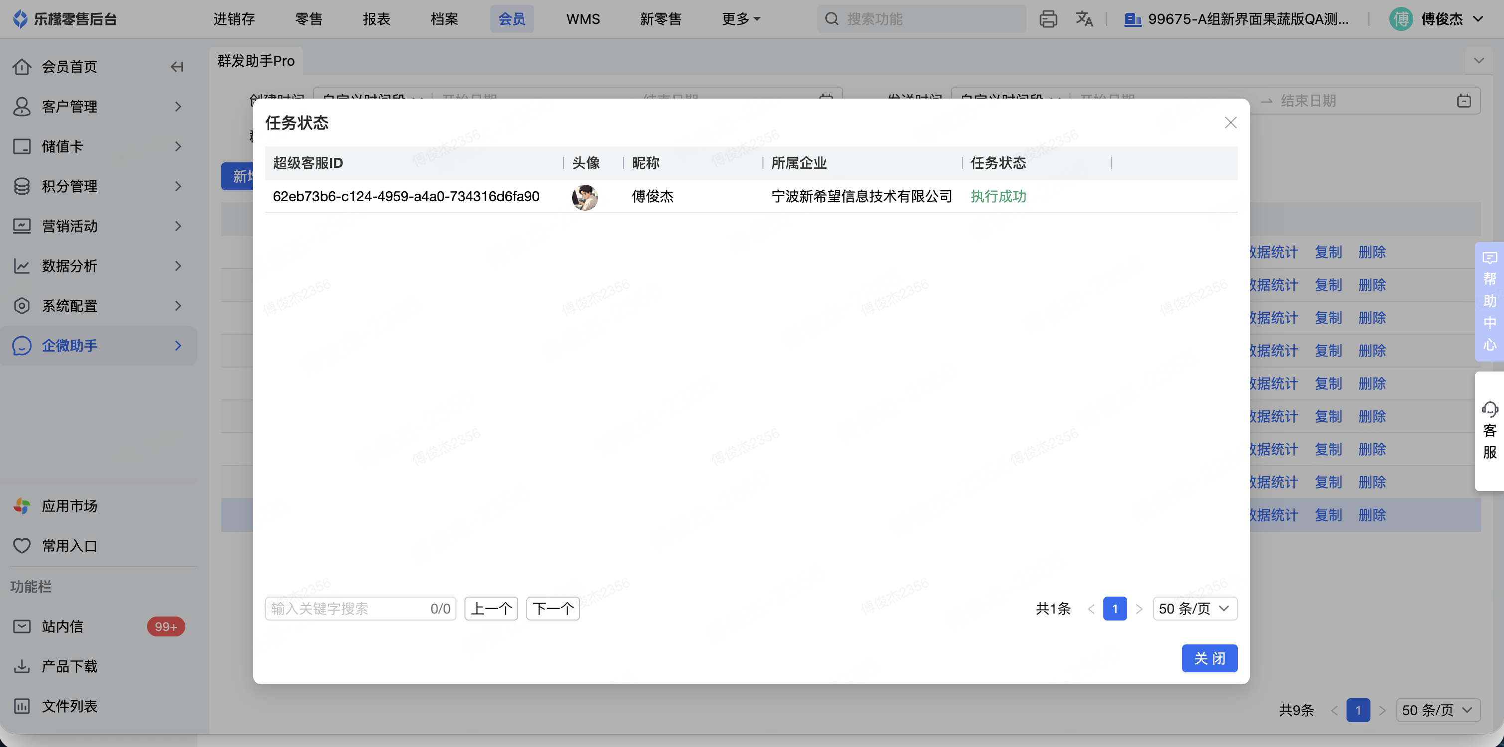 3、您可以点击列表中的「任务状态」按钮,查看超级客服执行群发的任务进度,同样也支持查看单条群发任务的发送数据统计