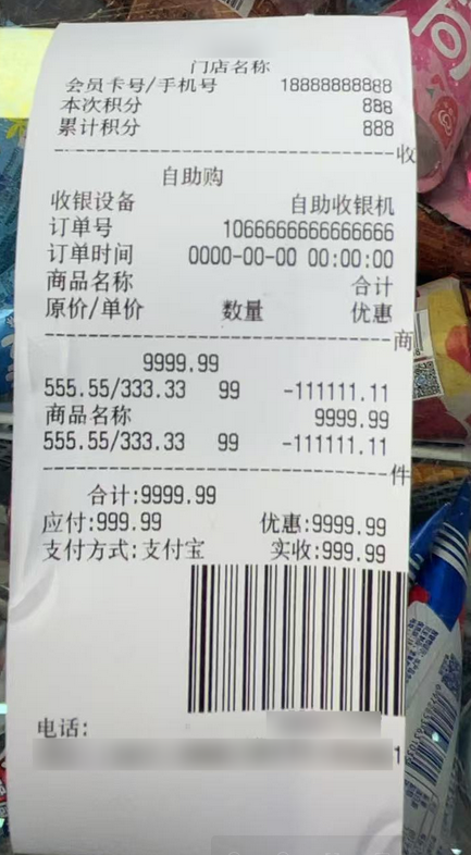 部分品牌自助购设备小票纸是58mm,在进行结账小票打印时,打印出来的内容尺寸不对、内容显示不全,如下图,小票纸张58mm,打印出来的尺寸却是80mm的尺寸,且前台设置中也将程序的纸张大小调整为了58mm,但打印依旧存在异常