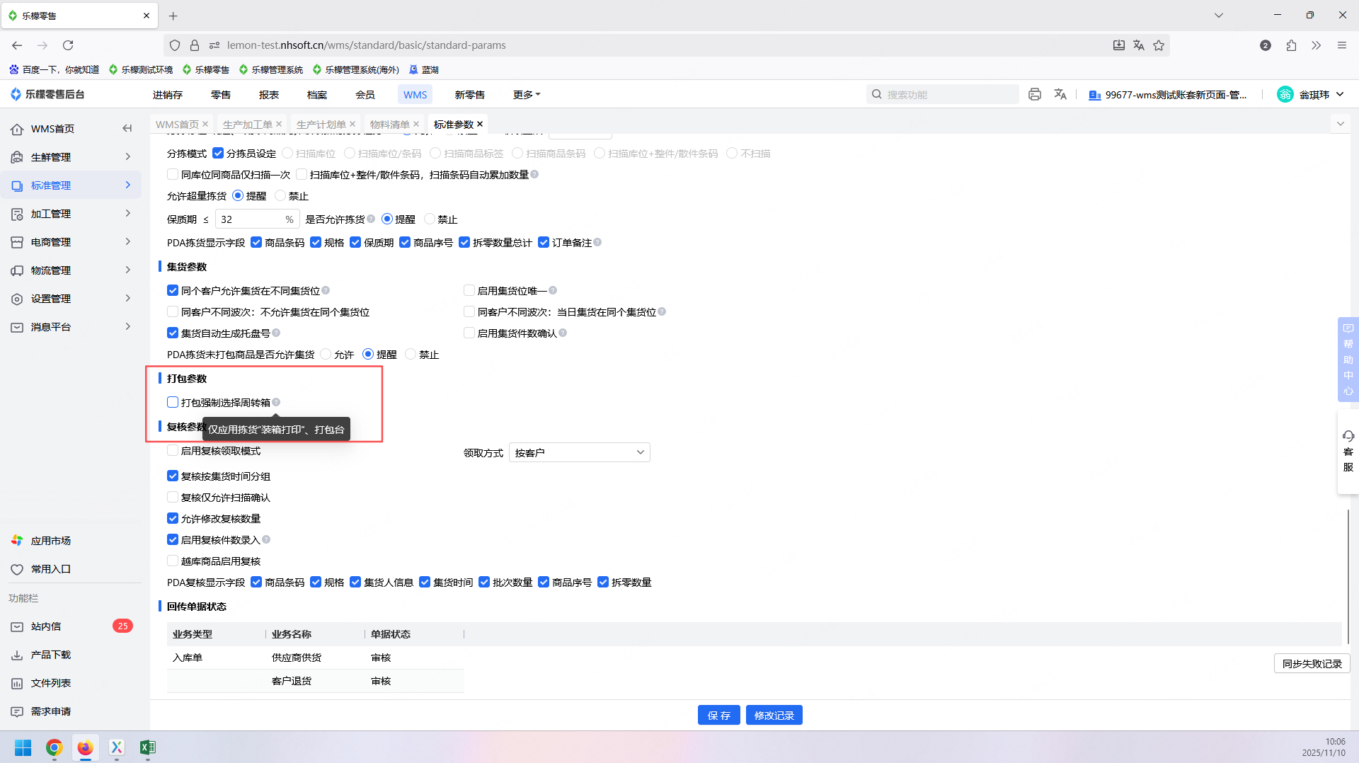 1、WMS-标准管理-标准参数:打包强制选择周转箱