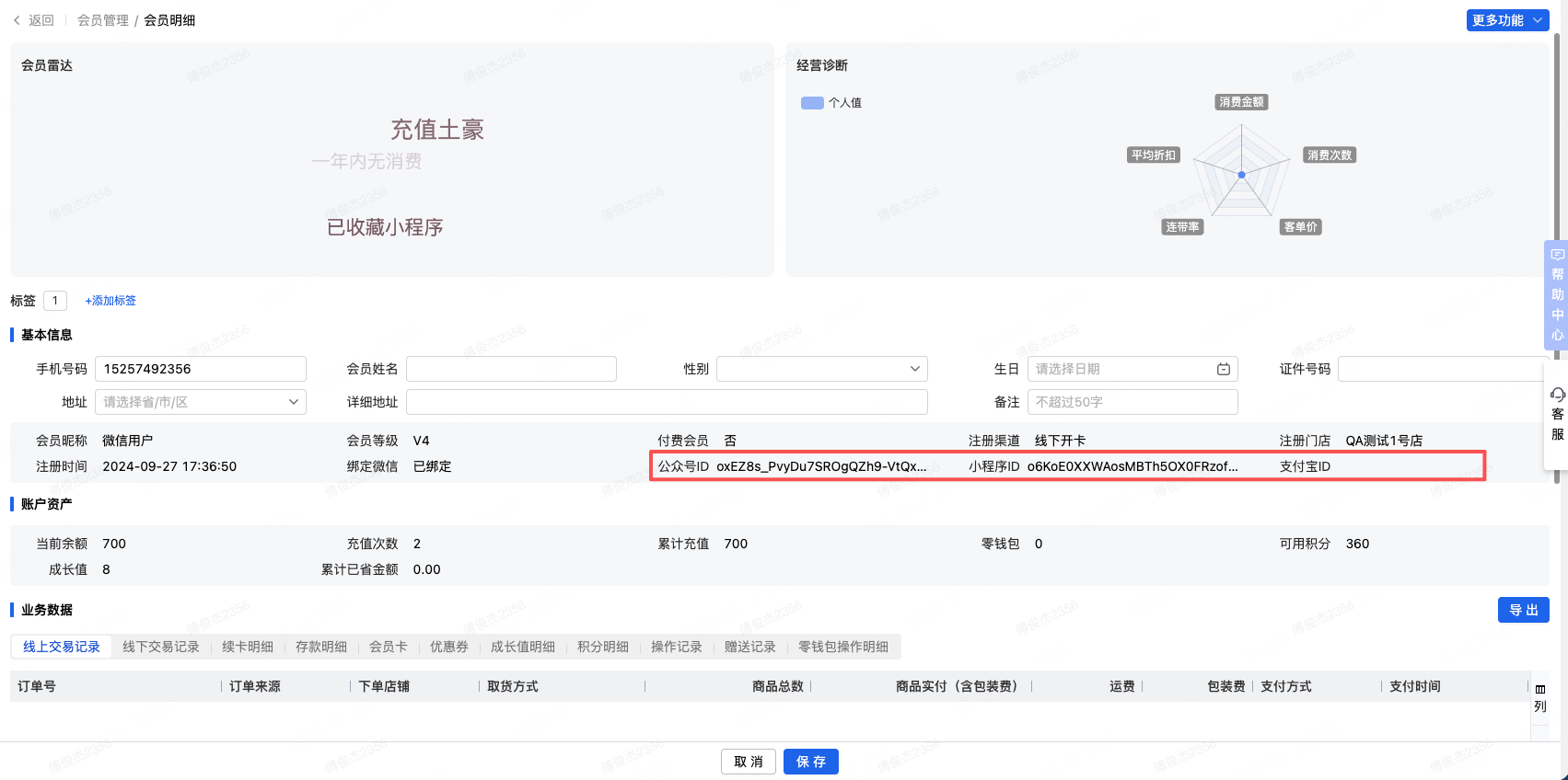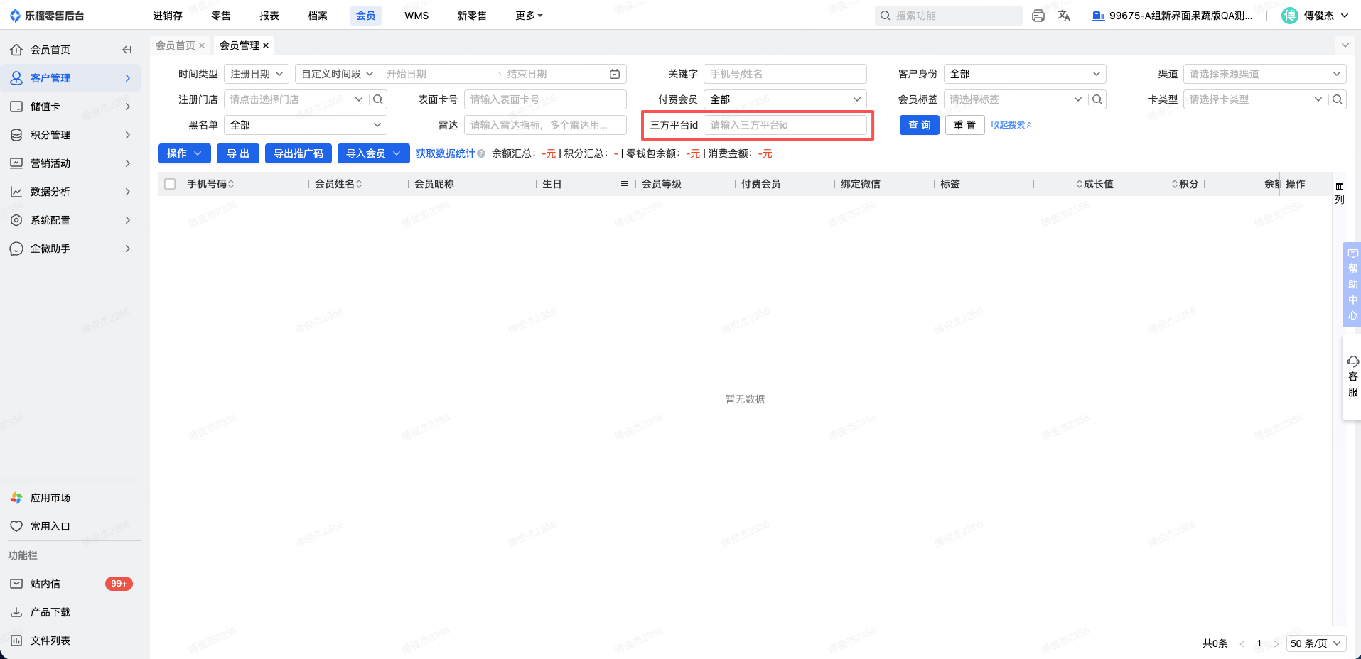 全渠道会员-会员管理页面,新增了「三方平台id」,可根据会员详情页面中「公众号id」、「小程序id」、「支付宝id」三者的任意值进行查询,这三个平台id均唯一,可精确定位到单个会员