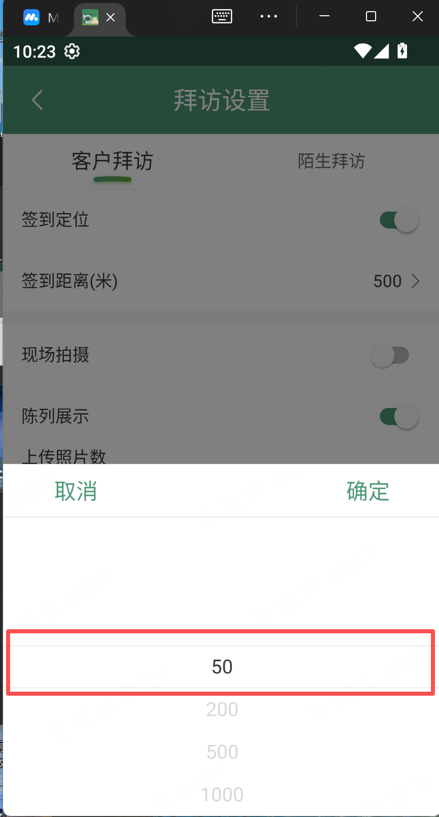 1、拜访设置-客户拜访开启“签到定位”:签到距离增加一个“50”的选项