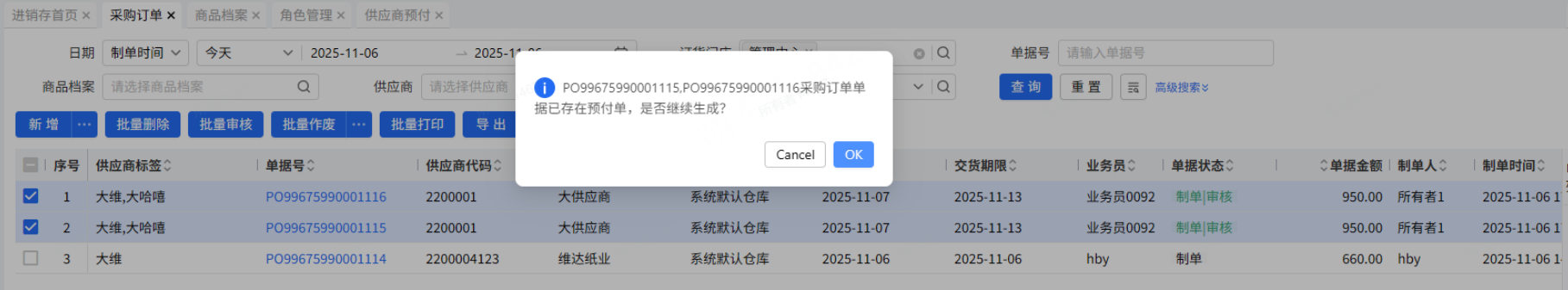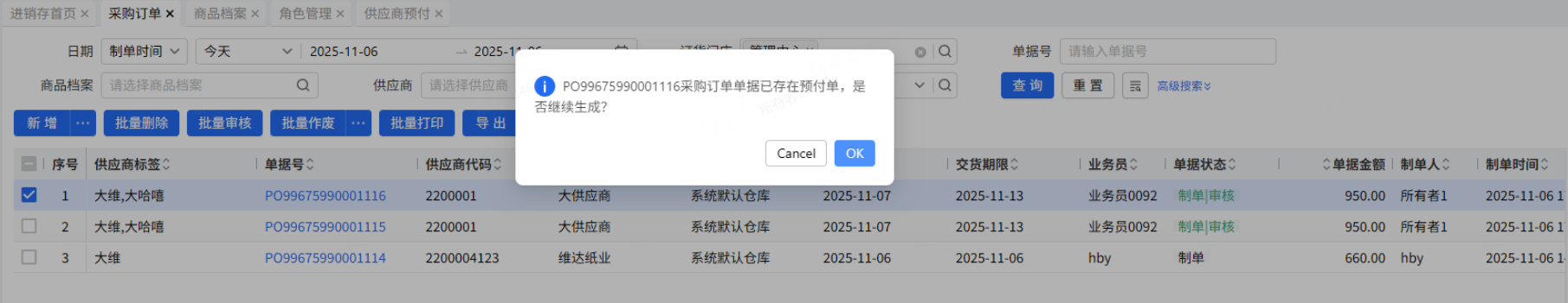 对应单据采购订单生成过预付单,增加弹窗提示“PI60099992403020005采购订单单据已存在预付单,是否继续生成?
