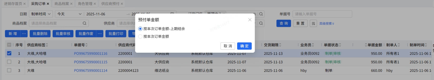 当前预付金额=订单金额会有校验控制,不允许生成。部分预付进行上述提示。