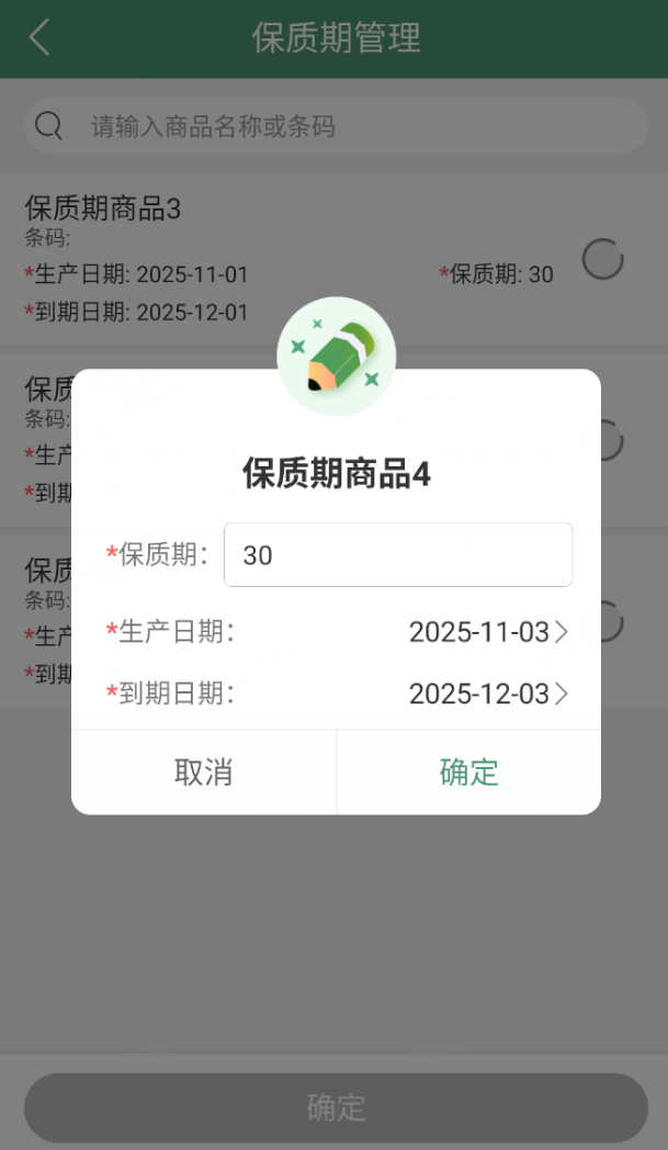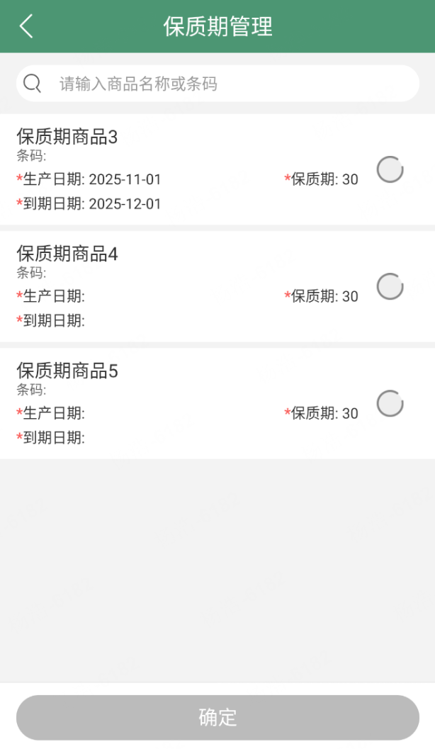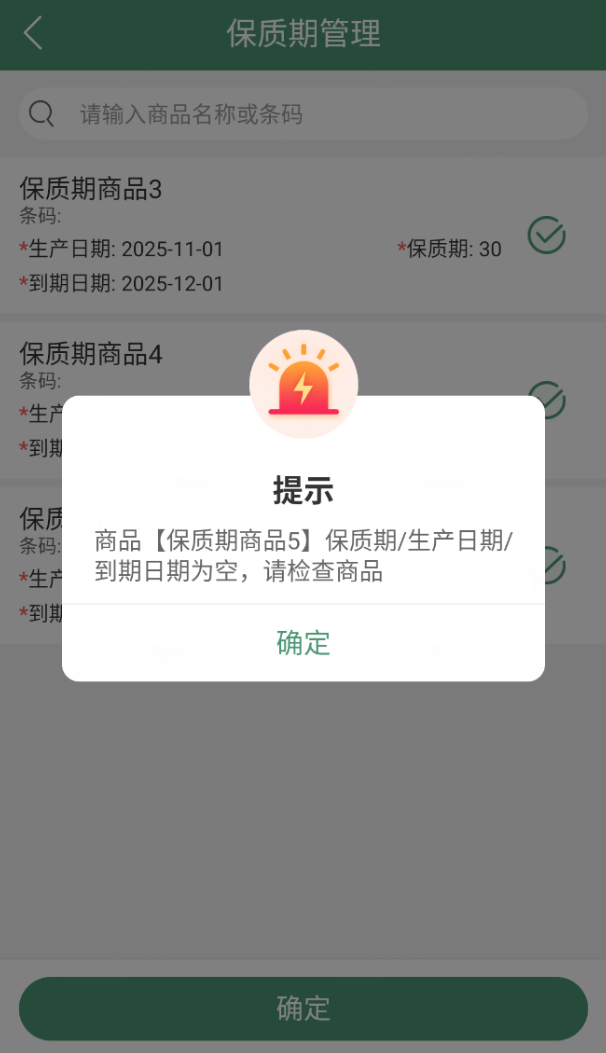 点击确定后,校验勾选的商品,保质期、生产日期、到期日期是否为空,空则提示:商品[商品名称]保质期/生产日期/到期日期为空,请检查商品