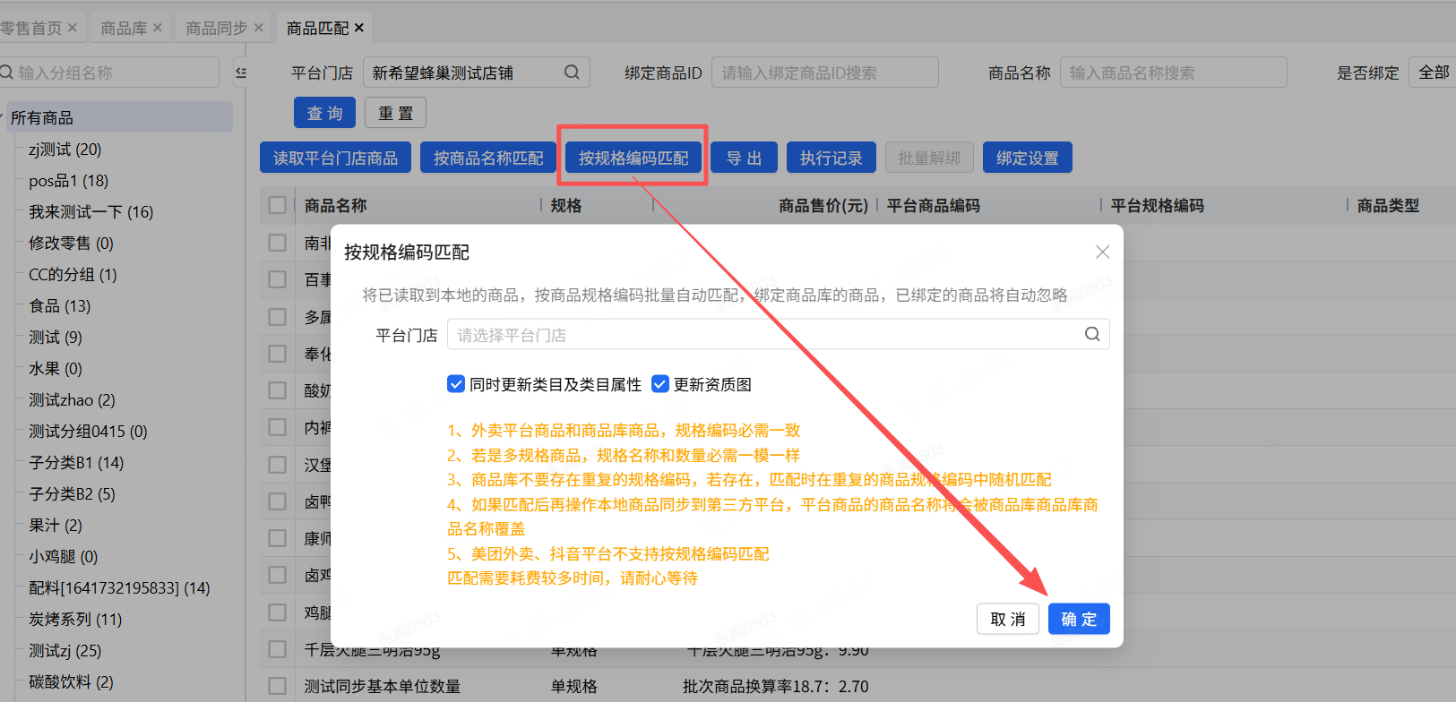 使用按规格编码匹配时,系统不再校验规格名称,只要规格编码(对应三方的条码)一致就可以匹配的上。