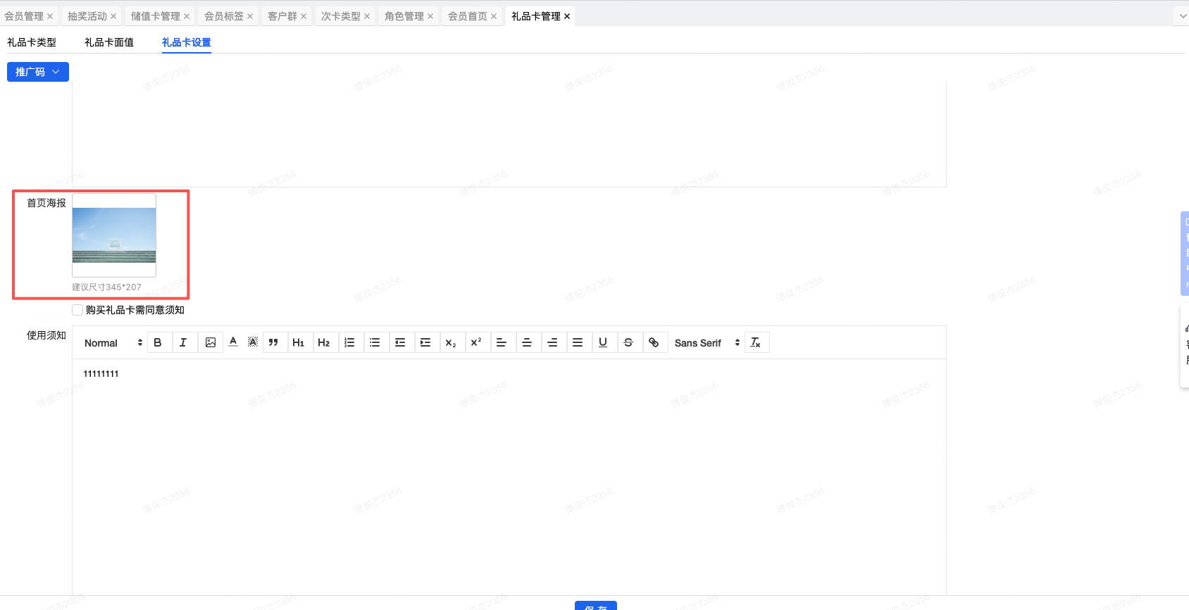 1、全渠道会员-礼品卡设置,新增首页海报,用于客户设置礼品卡的首页提示