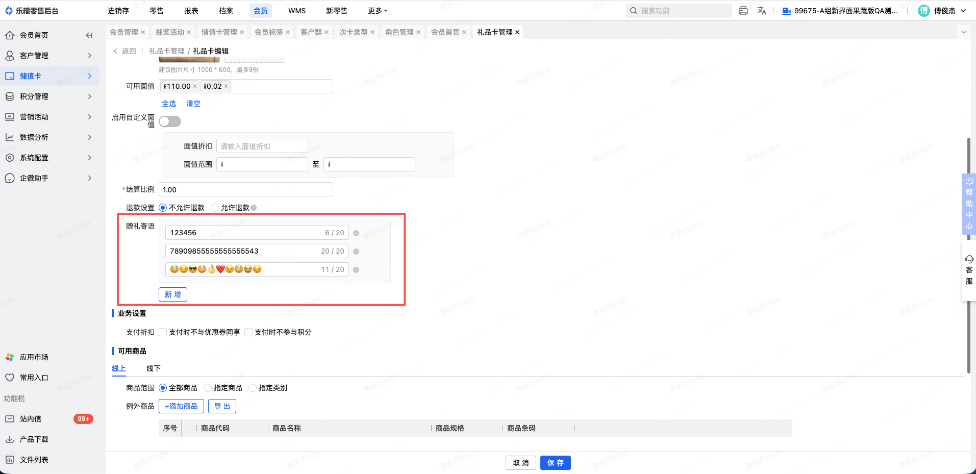 2、礼品卡类型,新增赠礼寄语,用于顾客购买礼品卡时,快捷设置赠礼的祝福语