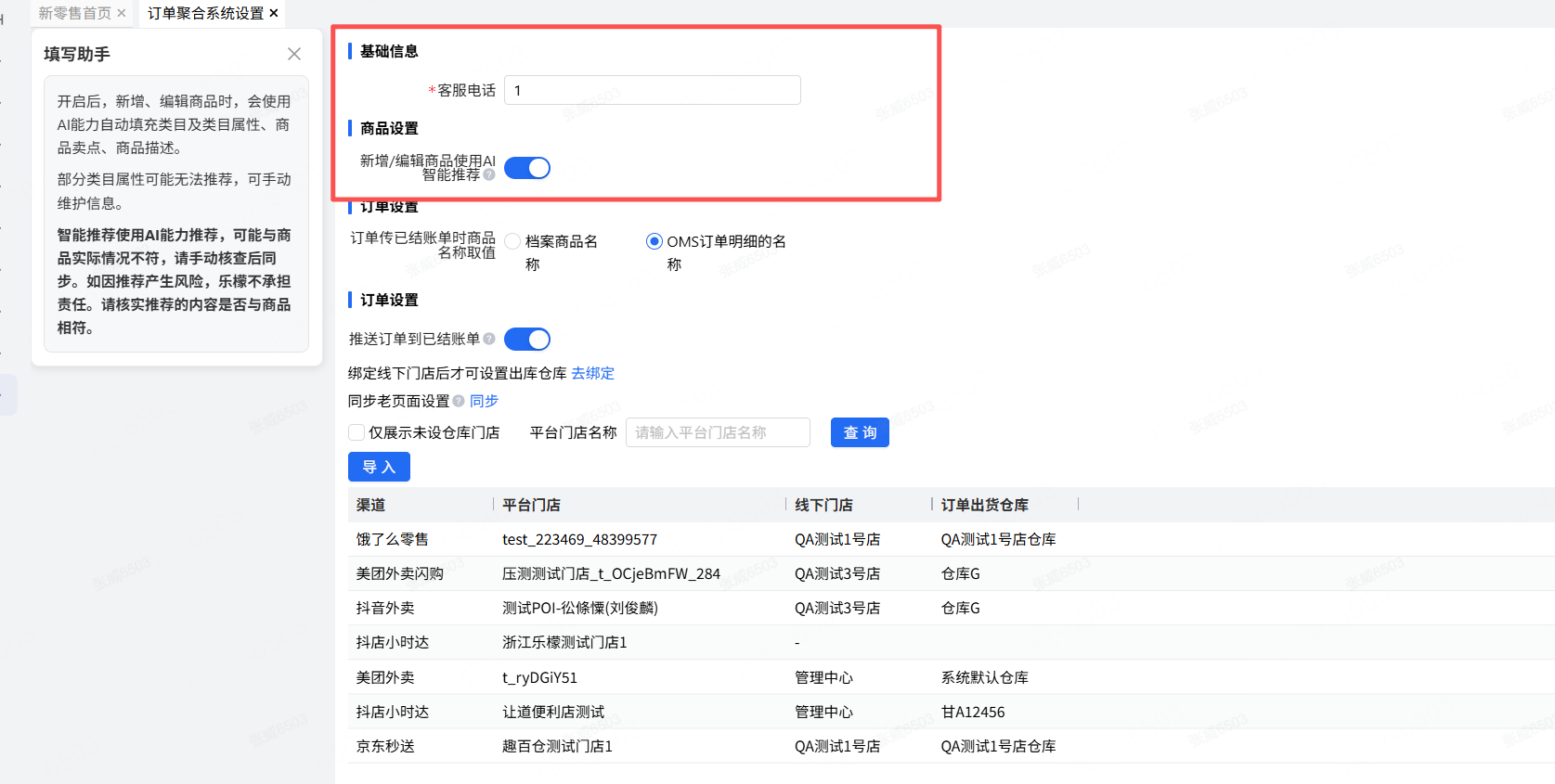 本次系统升级迭代,为提高商家操作灵活度,对订单聚合系统设置优化,主要功能包括:1、增加选项控制是否开启AI推荐;2、将“基础信息”内容移动至“订单聚合系统设置”