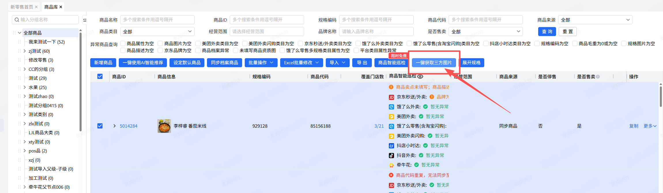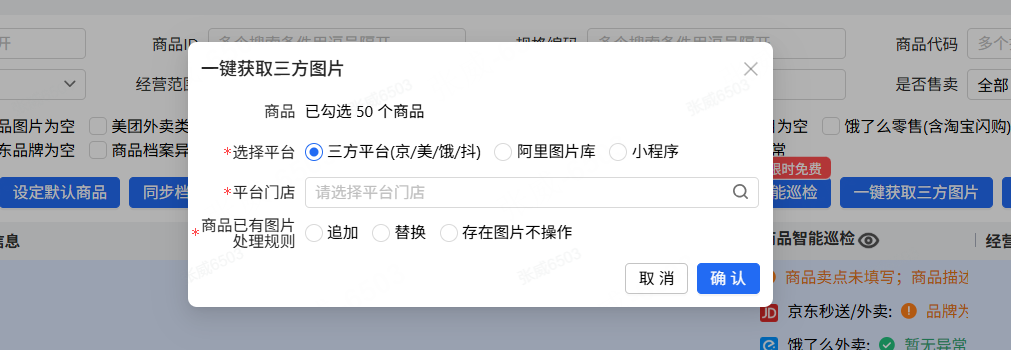 三方平台(京/美/饿/抖) | 商家已经在三方开店,且已经维护好商品、图片信息。 需要选择获取哪个门店的图片。 需商家提前绑定好门店及商品 |