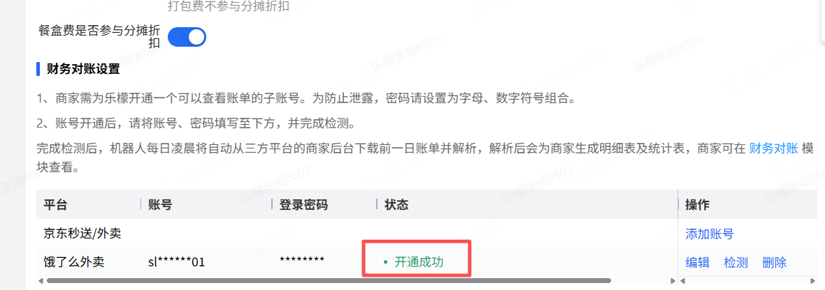 检测完成后,状态会变为开通成功,如果失败/修改密码需重新检测