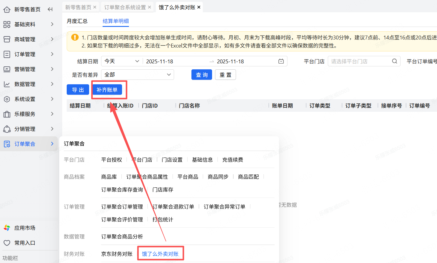 在“订单聚合-财务对账-结算单明细”中,点击“补齐账单”
