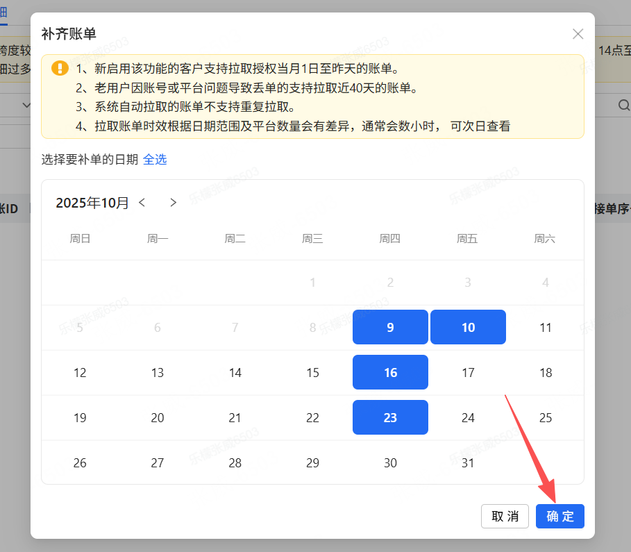选择需要补齐的日期,点击确定即可。(拉取匹配需要一定时间,建议1小时后查看)