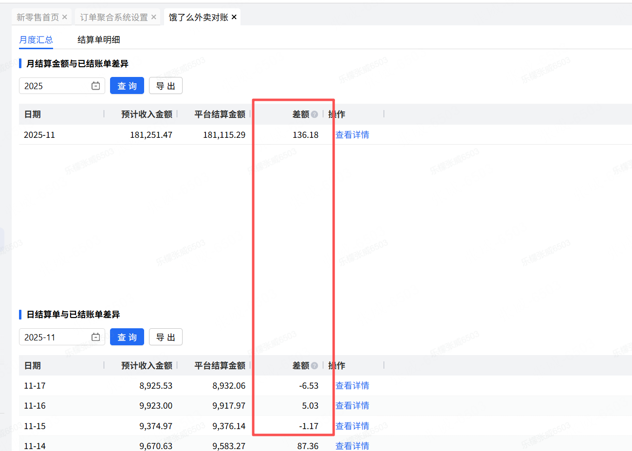 商家可在“订单聚合-财务对账-月度汇总”中,查看每月/日账单是否有差异,如无差异则不用关心,如有差异可查看明细