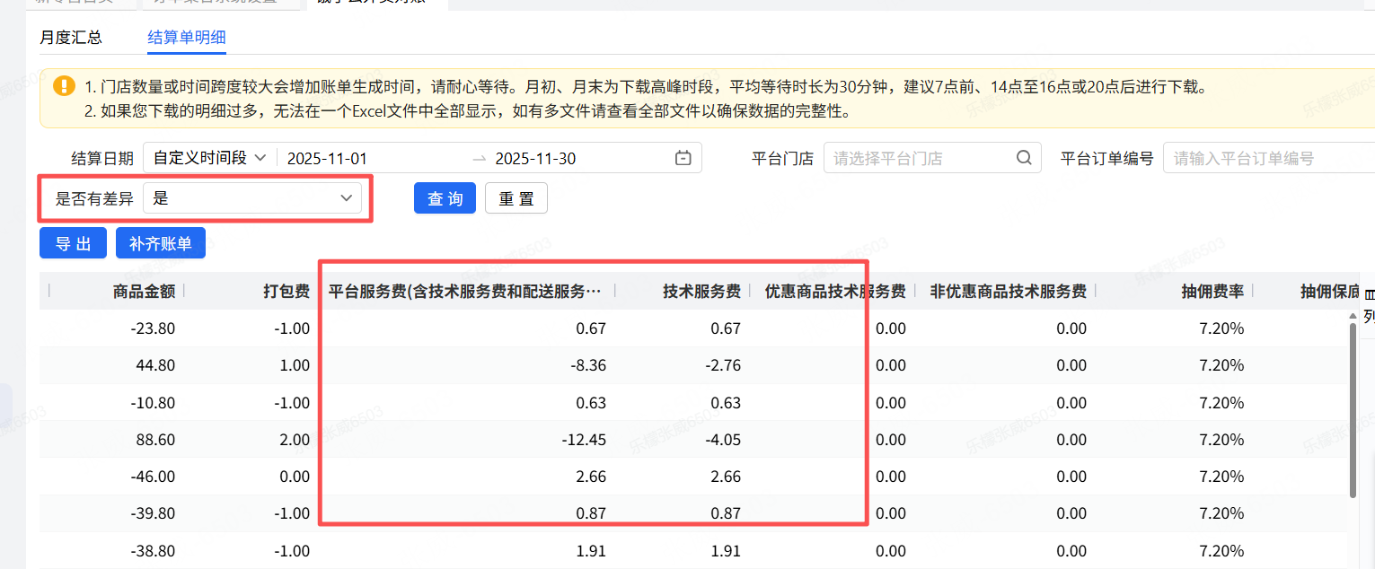 商家可在“订单聚合-财务对账-结算单明细”中,查看具体差异费项,根据企业管理方式进行做账。