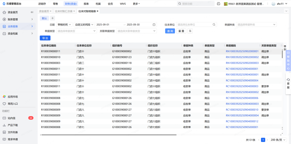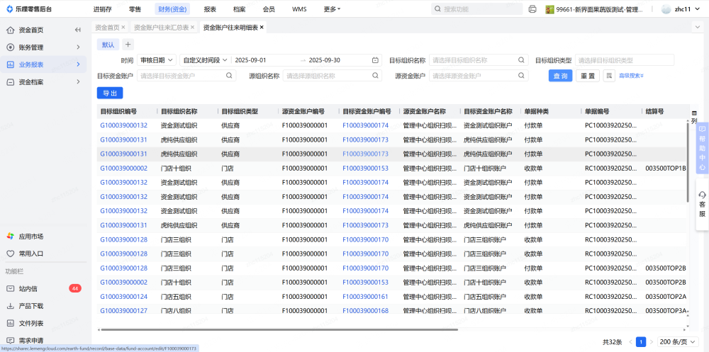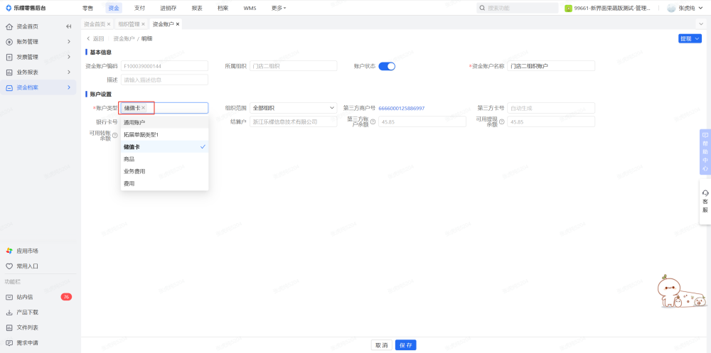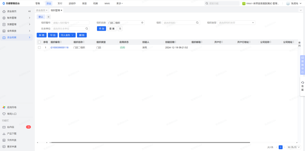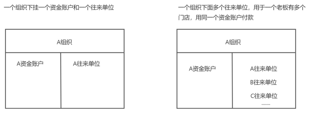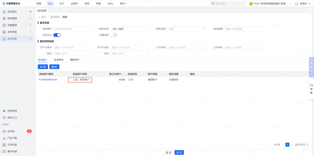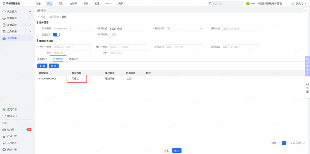 例如这里门店二组织下,绑定的资金账户是门店二组织资金账户,绑定的往来单位是门店二