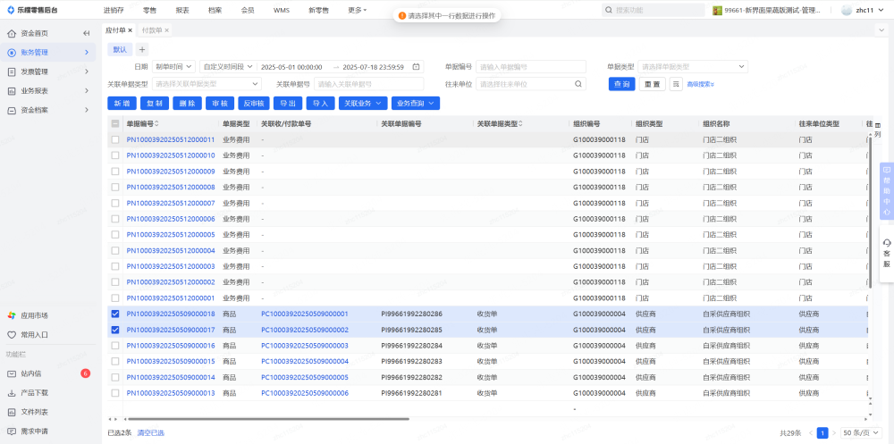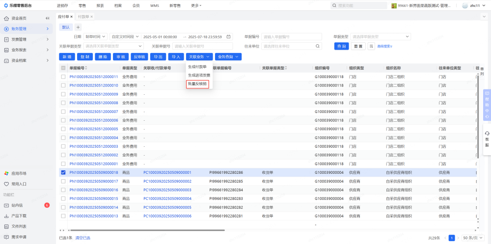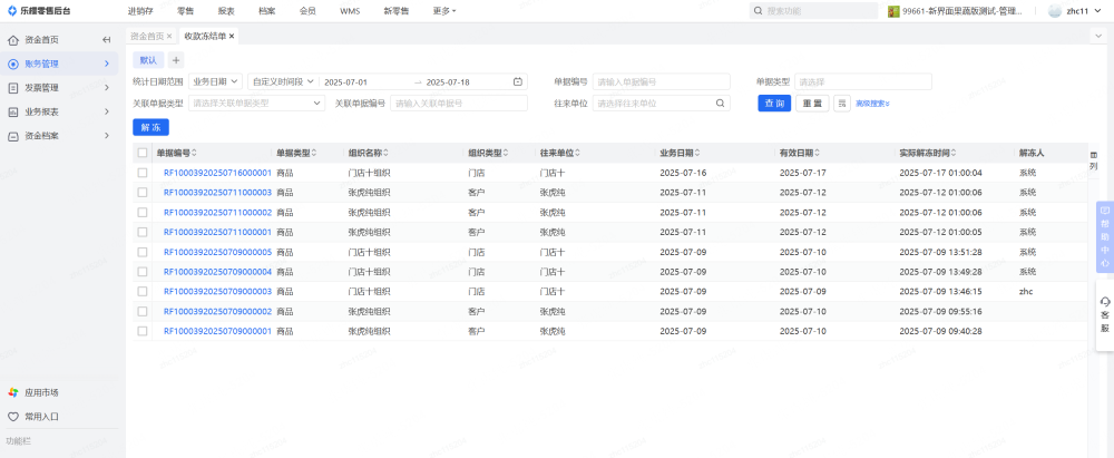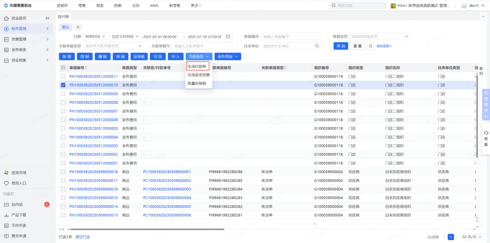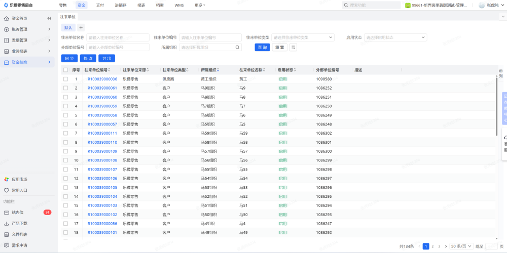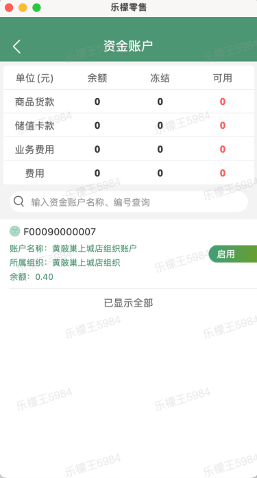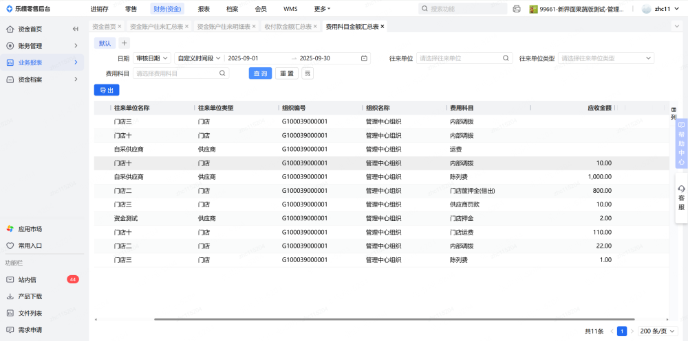 例如这里门店二组织下,绑定的资金账户是门店二组织资金账户,绑定的往来单位是门店二
