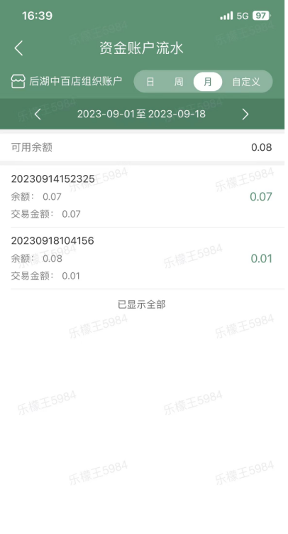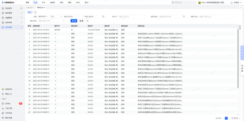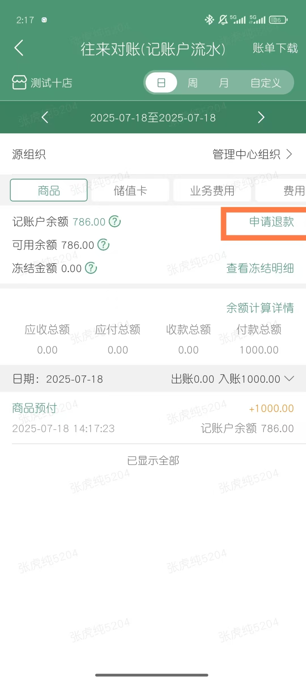 在资金账户流水中,可查询当前门店账户余额的变动流水情况。时间可按日、周、月等查询。