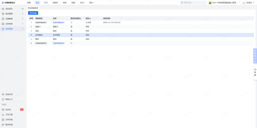 账户类型:默认有四个,分别是商品、储值卡、费用、业务费用。默认不开启的两个拓展单据类型,需要自行开启,展示名字可以修改