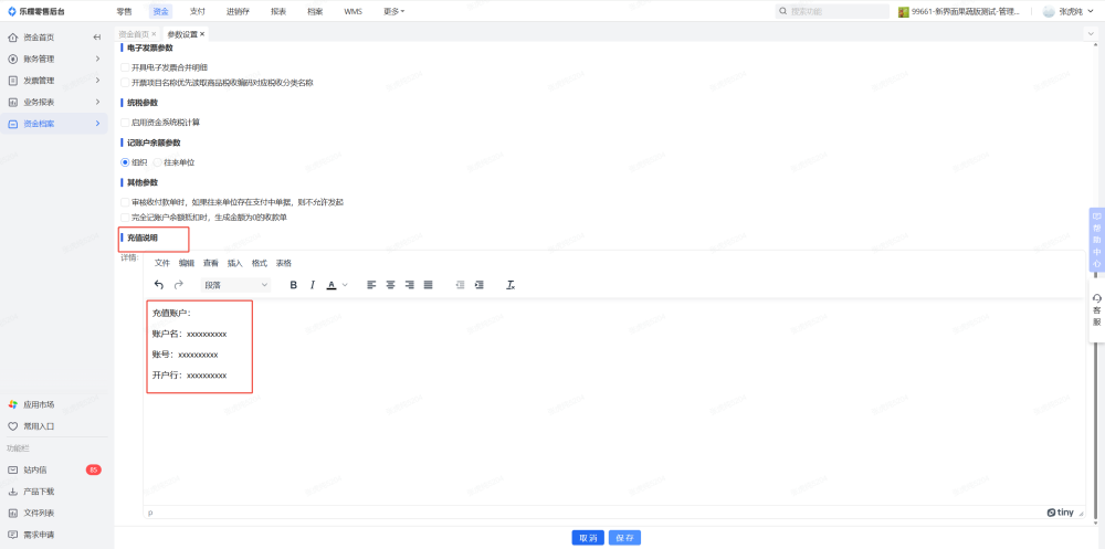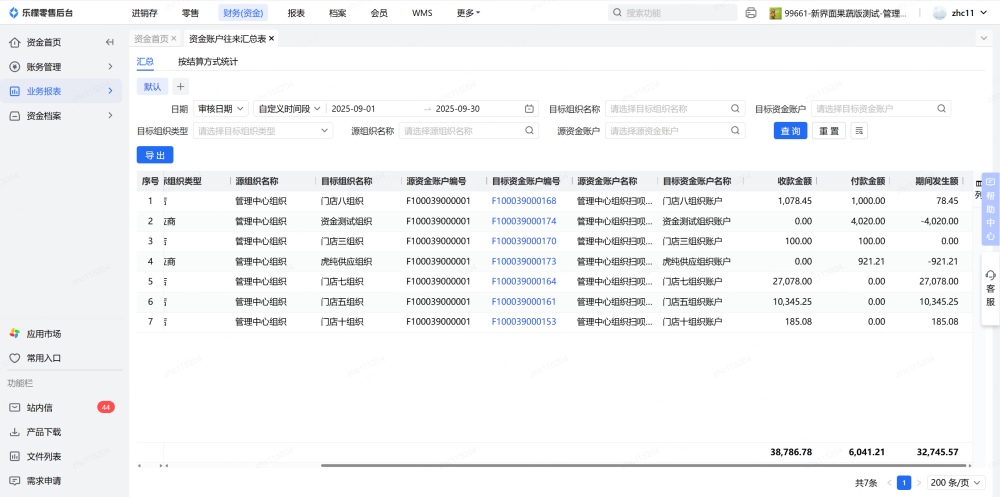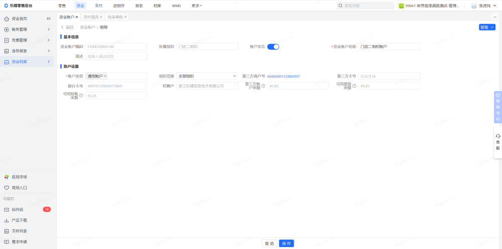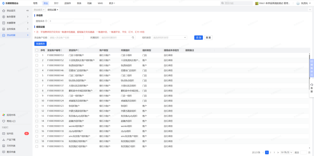 关联第三方账户与组织,使组织间可以特定的账户进行转账,可修改资金账户状态 、资金账户名称、账户类型、组织范围等数据